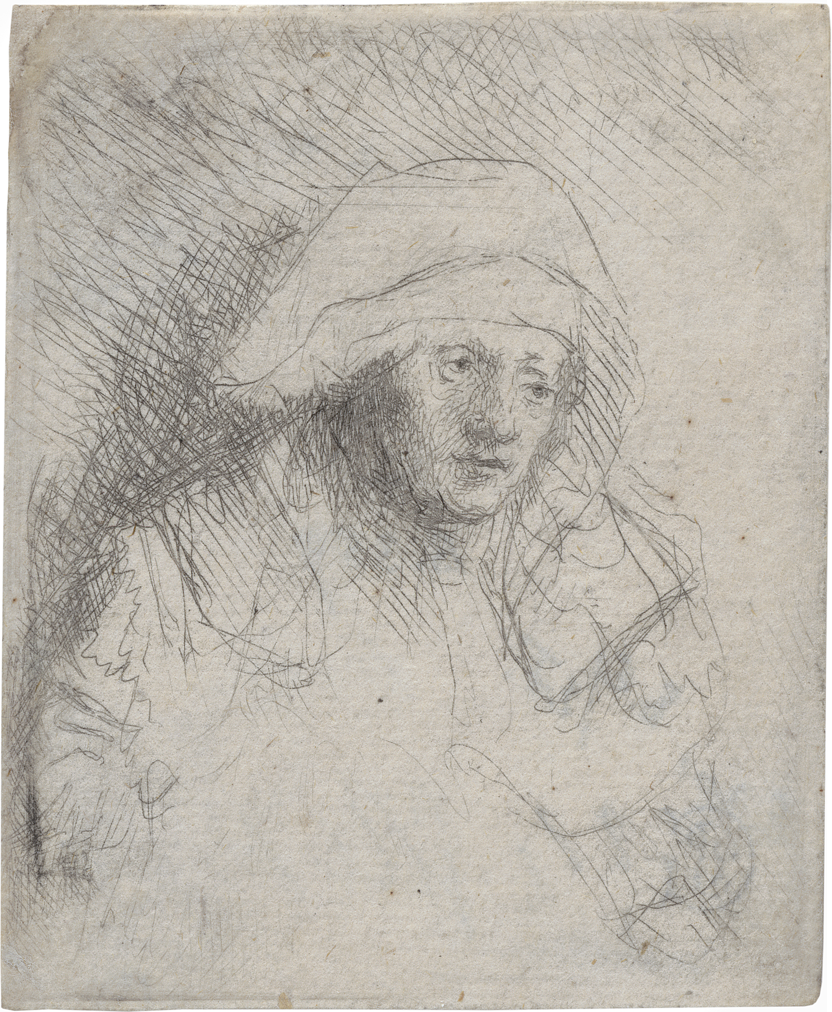Kranke Frau mit großem Kopftuch (Bildnis Saskias). Radierung. 6,2 x 5,1 cm. Um 1642. B. 359, White/Boon (Hollstein) 196, Nowell-Usticke 359, Hinterding/Rutgers (New Hollstein) 228.