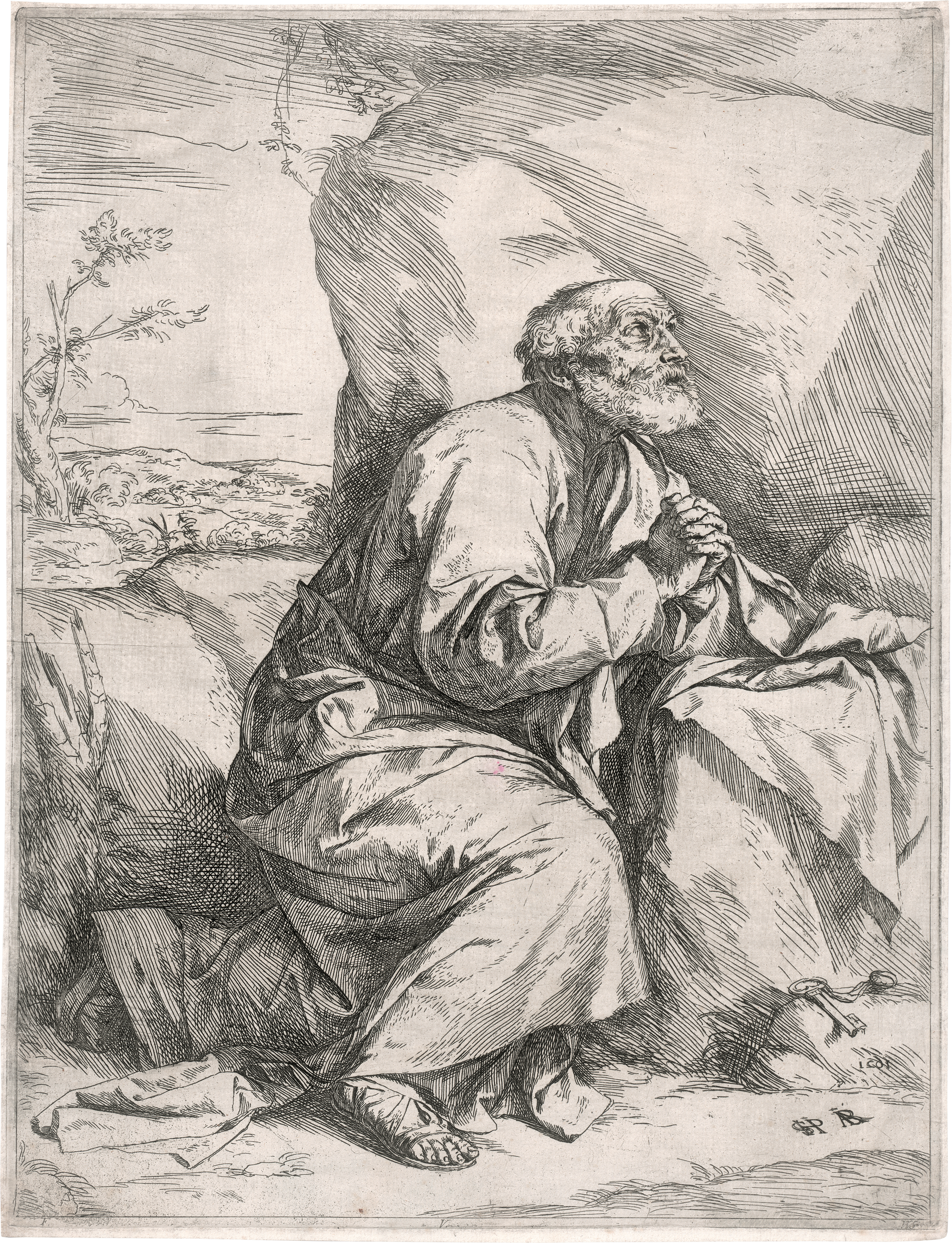 Die Buße des hl. Petrus. Radierung. 32,1 x 24,6 cm. 1,4 x 23,8 cm. 1621. B. 17, Brown 6 II. Wz. Reich geschmücktes Krüglein mit Vierblatt und Halbmond darüber.