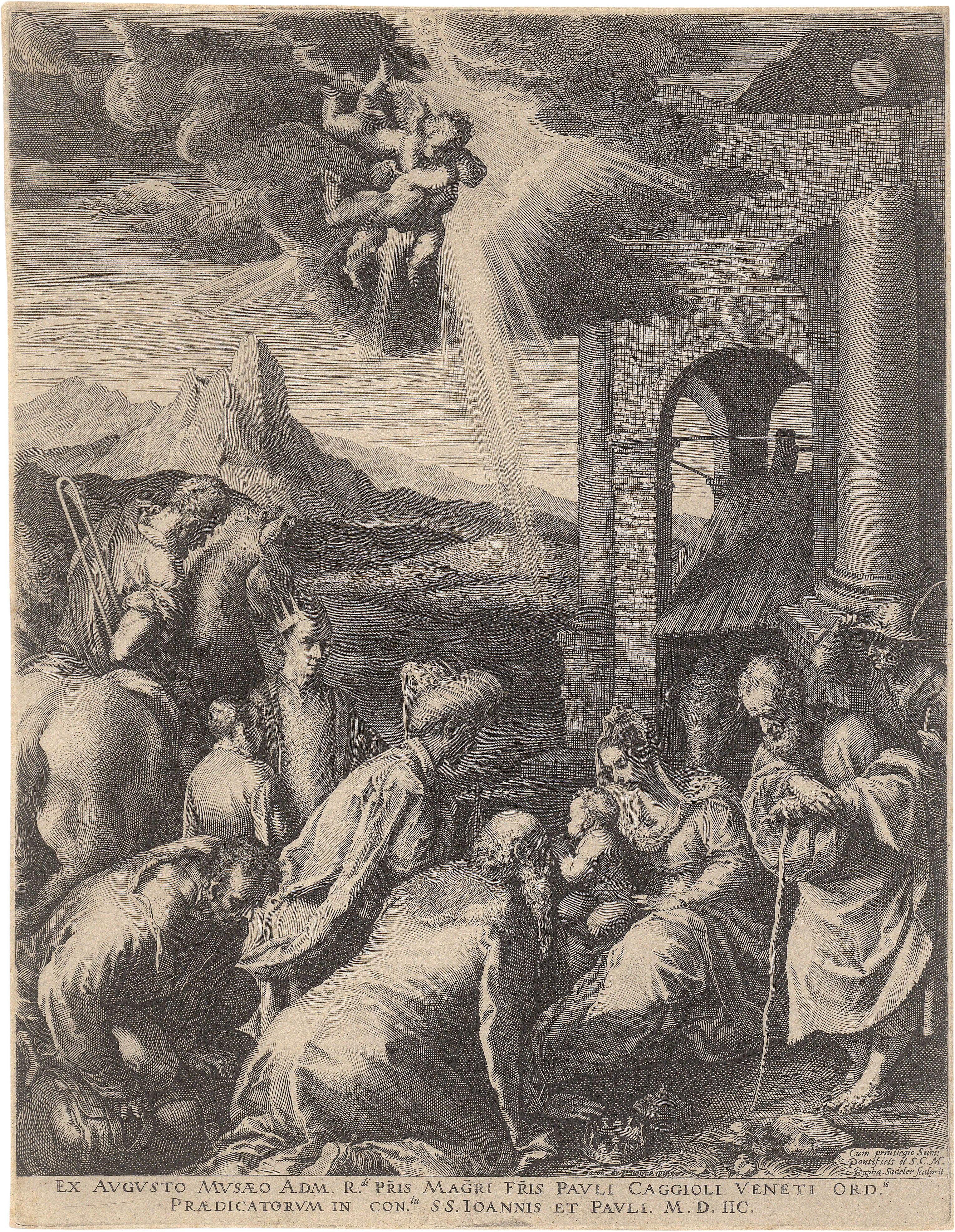 Die Anbetung der Könige. Kupferstich nach Jacopo Bassano. 26,8 x 20,6 cm. 1598. Hollstein 14. Wz. Greif.