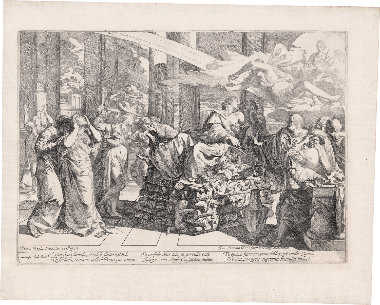 Dido auf dem Scheiterhaufen, wie ihr Iris das Haar abschneidet. Radierung nach Pietro Testa. 32,9 x 46,3 cm. Nagler 11. Wz. Lilie im Kreis mit Krone darüber.