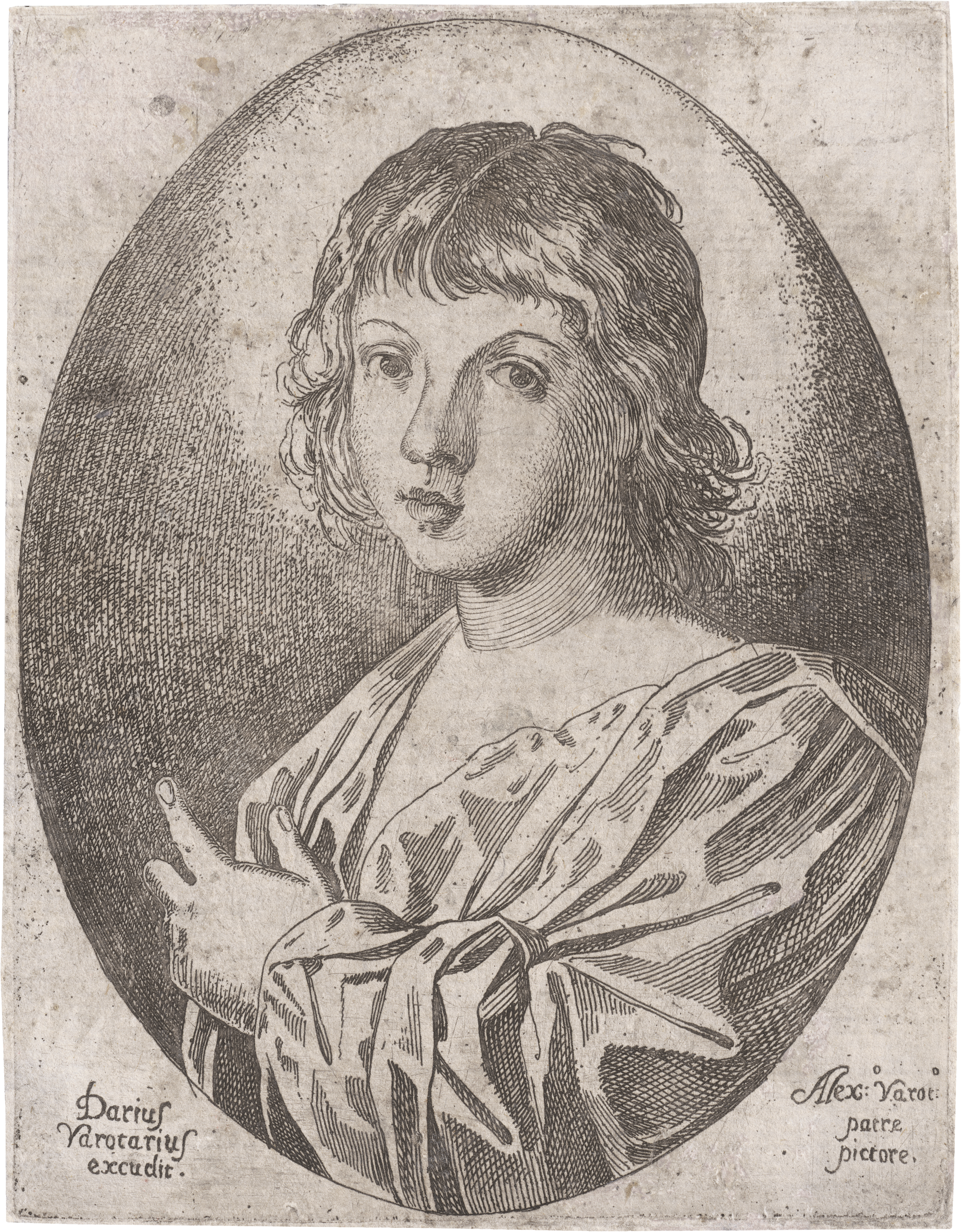 Dario Varotari der Jüngere, Sohn des Malers Alessandro, war Arzt, Dichter, dilettierender Maler und Radierer in Padua. Lediglich fünf Blätter listet Nagler auf, darunter das vorliegende sehr seltene Bildnis eines Jünglings, das laut Bezeichnung nach einem Gemälde des Vaters Alessandro entstand. Möglicherweise handelt es sich um den Evangelisten Johannes oder einen anderen Heiligen. Ausgezeichneter Abzug mit feinem Rändchen um die Plattenkante. Minimal fleckig und geringfügig angestaubt, kleine sorgsame Hinterfaserungen am oberen und unteren Rand, sonst in sehr guter Erhaltung.