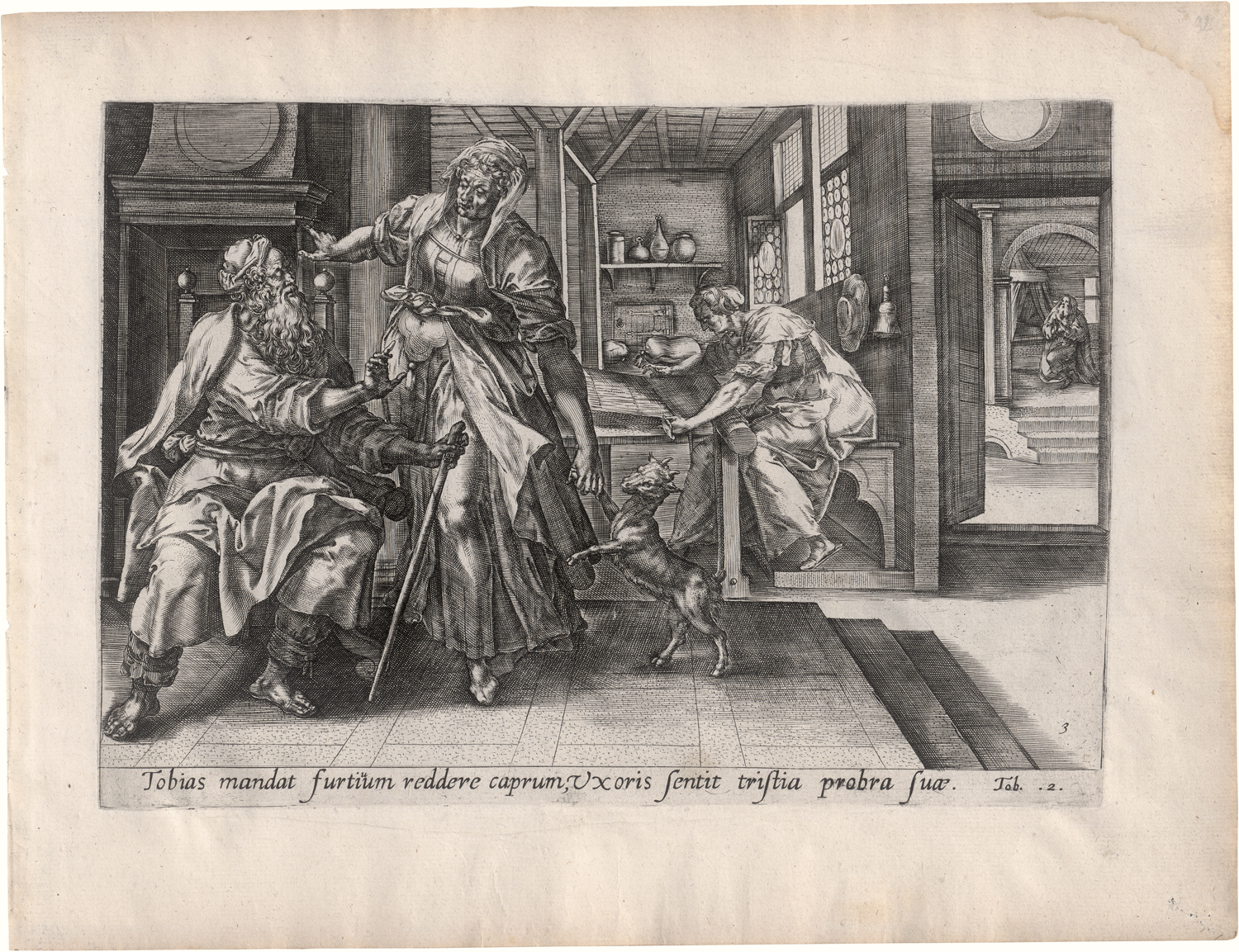 nach. Die Geschichte von Tobias. 6 Kupferstiche mit Radierung, womöglich von Hieronymus Wierix. Je ca. 19,5 x 27,5 cm. Um 1582-85. Hollstein 166-171, je I (von II). Wz. Krüglein.