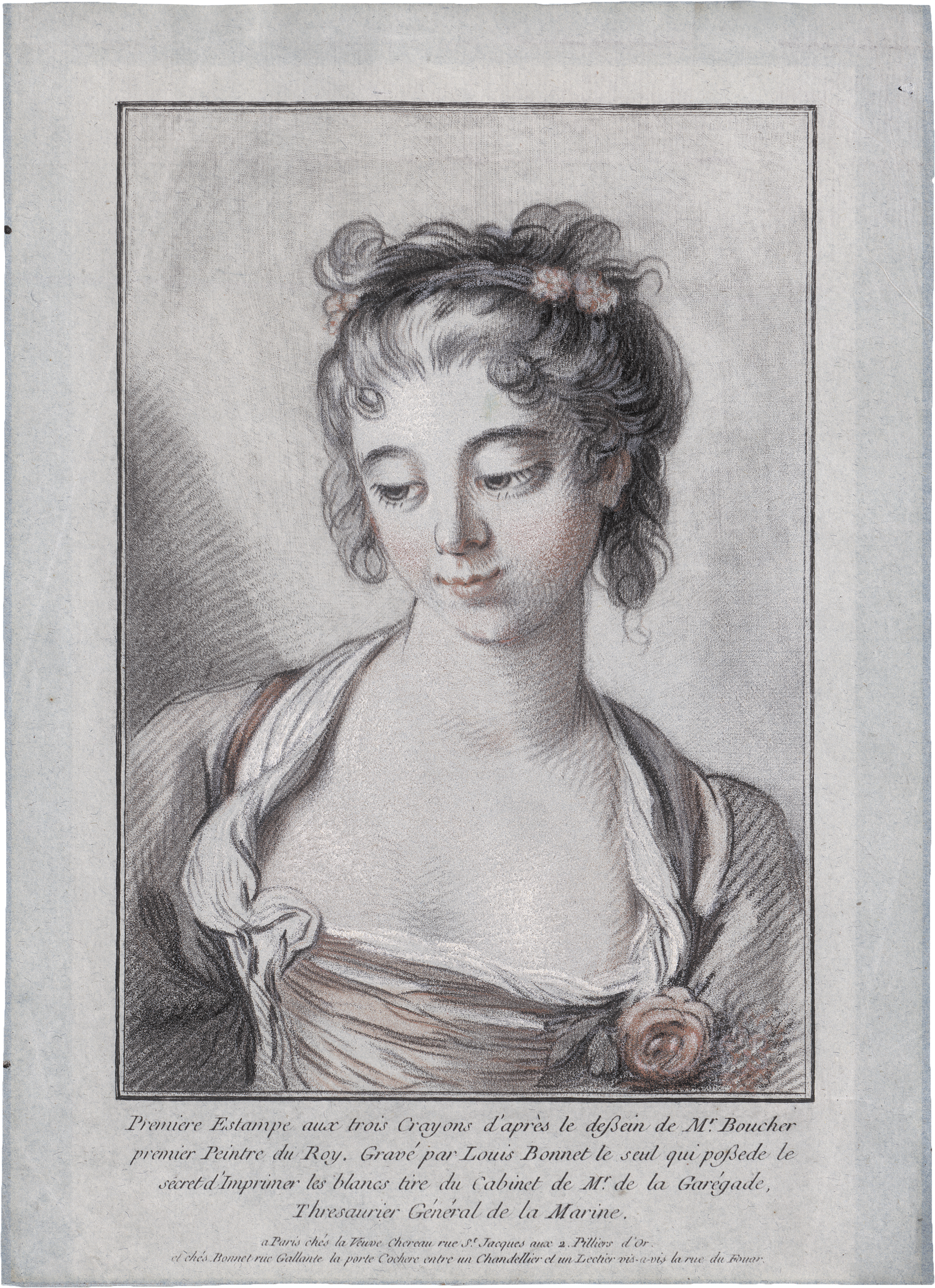 Louis-Marin Bonnet gilt als der Erfinder der Farbradierung, die bis in das feinste Detail die Wirkung einer Kreidezeichnung, im Fortlauf der technischen Möglichkeiten auch Pastellzeichnungen nachzuahmen vermochte. Die vorliegende, anmutige Darstellung einer jungen Frau mit einer am Dekolleté gesetzten Rose geht zurück auf eine Vorlage von François Boucher. Wie der Text des ersten, frühen Druckzustandes verrät (Premiere Estampe aus trois Crayons d'après le deßein de Mr. Boucher), handelt es sich um die erste Radierung, die Bonnet überhaupt in dieser mehrfarbigen Radiertechnik ausführte, und die er später zur Perfektion bringen wird. Prachtvoller Frühdruck dieses für den Farbstich bedeutenden Blattes in einem ersten Zustand vor der Veränderung des Textes, der Hinzufügung weiterer Einfassungslinien und der Verwendung einer zusätzlichen blauen und gelben Platte. Mit Rand um die Darstellung, unten mit dem Textrand, wohl knapp innerhalb der Plattenkante geschnitten. Geringfügig angestaubt, minimal lichtrandig, zwei winzige bestoßene, dünne Stellen außerhalb der Einfassung, kleine Montierungsreste verso, sonst ganz vorzügliches Exemplar. Von großer Seltenheit.