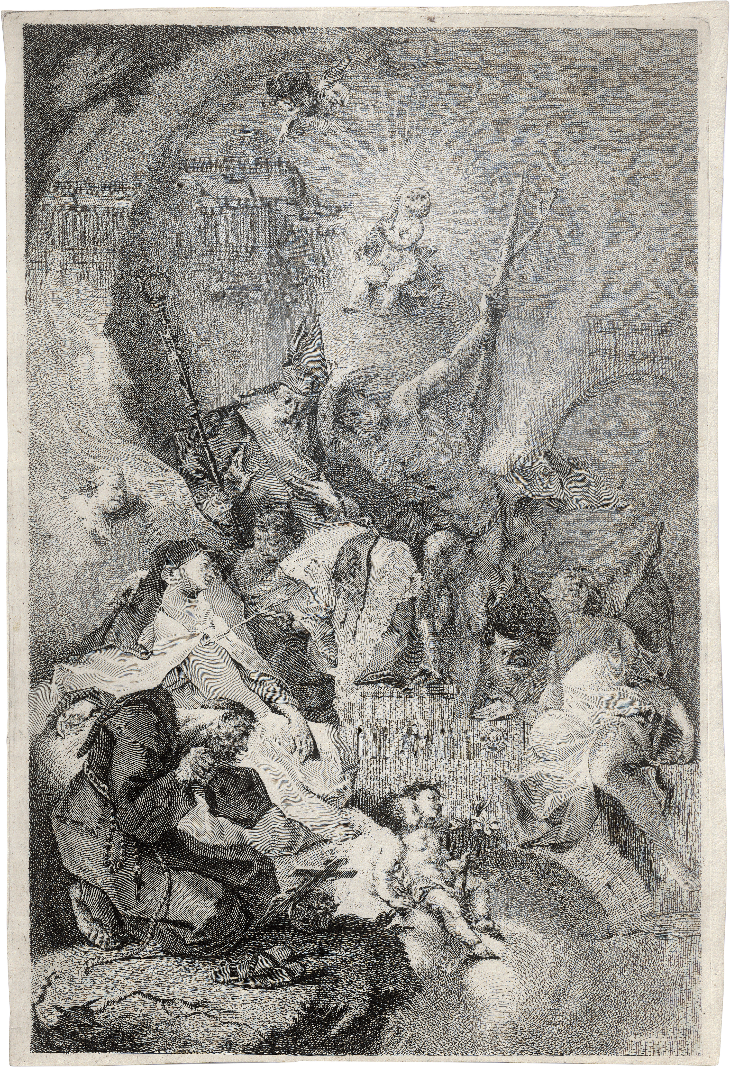 nach. "Maximus in Sanctis est parvulus ille Puellus" (Die hll. Franziskus Seraphikus, Christophorus, Theresa von Avila und Papst Clemens XIII). Radierung von Johann Beheim. 43,5 x 29,1 cm. 1762. Nicht bei Nagler, Le Blanc (Beheim) 2, Meyer, Allgemeines Künstler-Lexikon III, 335, 3, Haberditzel: Franz Anton Maulbertsch, Wien 2006, S. 211-212. Wz. undeutlich (Adler?).