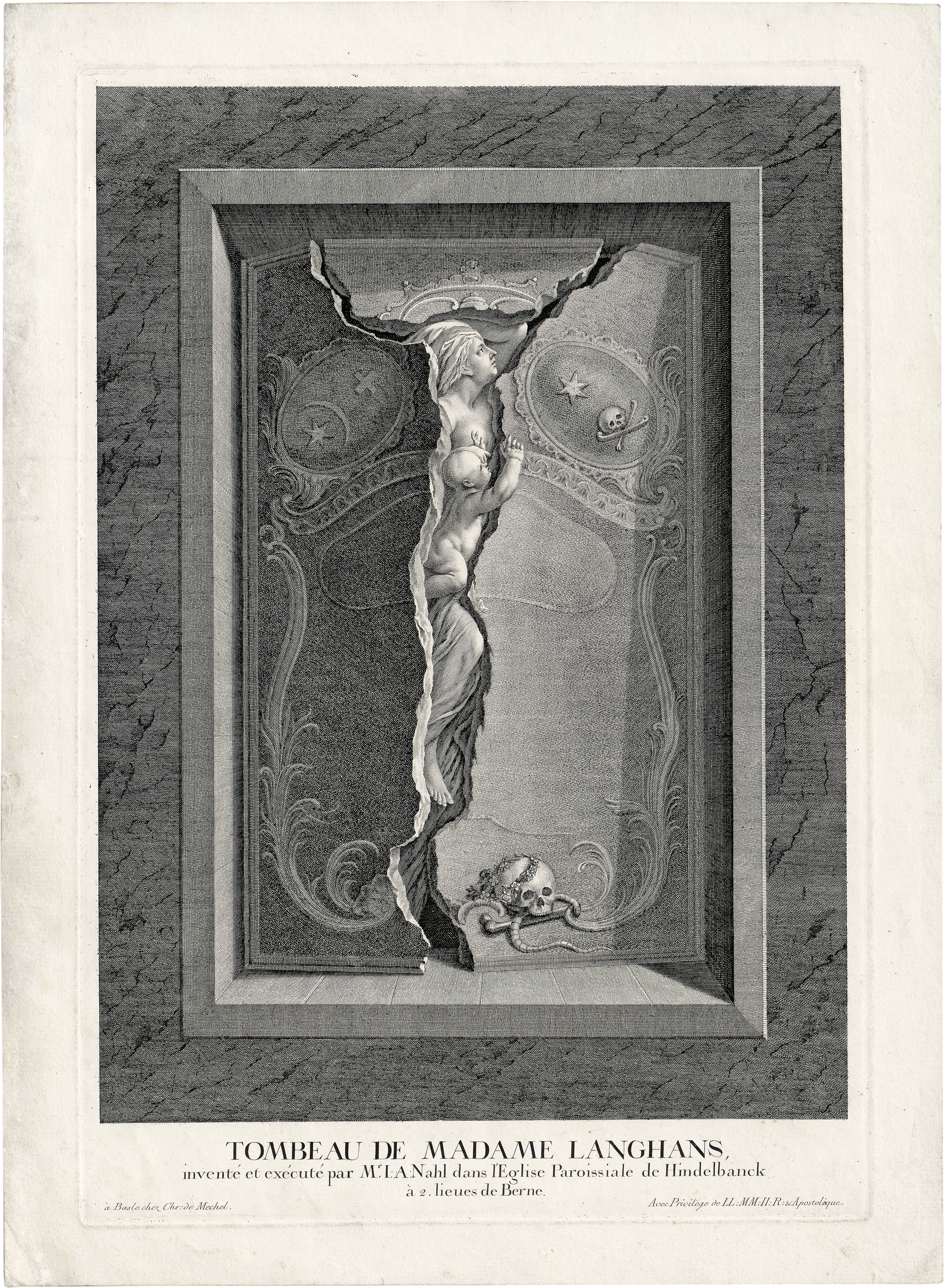 Das Blatt zeigt das Grabmal der 1751 verstorbenen Pastorin Langhans in der Kirche zu Hindelbank bei Bern. Es war bei den Zeitgenossen weit berühmt und "stellt die Mutter mit ihrem Kind dar, wie sie am Tage des jüngsten Gerichtes aus dem zerborstenen Stein hervorkommt" (Nagler, Nahl). Ausgezeichneter, gleichmäßiger Druck mit schmalem Rand. Etwas angestaubt und minimal fleckig, Knitter- und Gebrauchsspuren, sonst sehr gut.