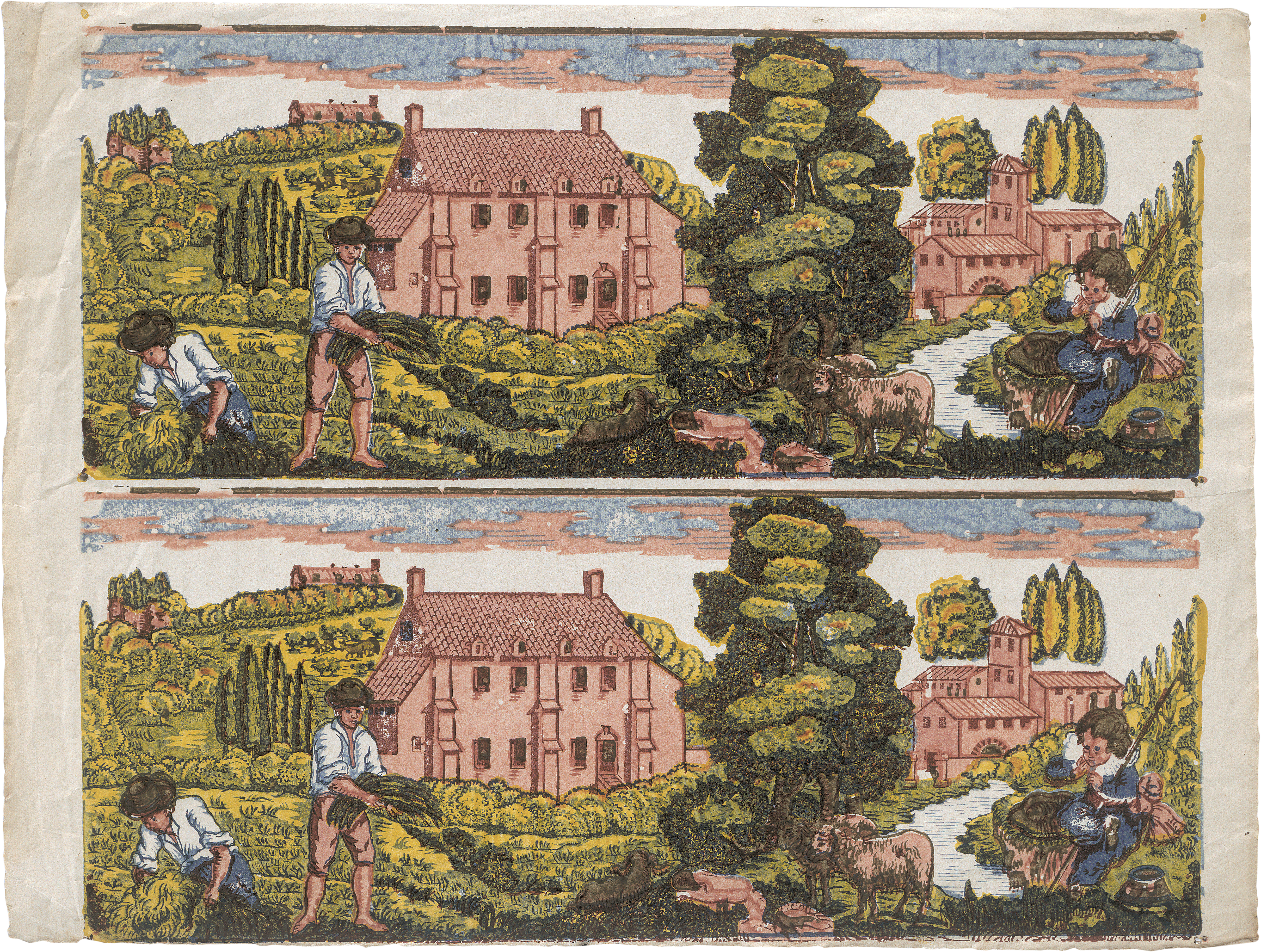 1. Guilloche-Ornament mit sich überlagernden Kreisbändern, gefüllt mit Blumen und Rosenvierpässen in Blau und Gelb auf Velin. - 2. Durchgehende Musterung mit klassizistischen Blumenvasen und Rankenumrahmung in Gelb, Blau, Hell- und Dunkelrosa auf gelatiniertem Büttenpapier. - 3. und 4. Vier üppige Blumenfriese geteilt durch tornierte Bänder in Gelb, Blau Hell- und Dunkelrosa auf Velin, 2 Blatt, je mit dem Trockenstempel von Remondini. - 5. Zwei friesartig angelegte pastorale Landschaften mit Bauern bei der Ernte und Hirte gedruckt in sechs Farben auf Velin. - Sämtlich auf den vollen Bögen, meist mit Schöpfrändern. Vereinzelte Randmängel und ebenda partiell schwach gebräunt, 5) links knitterfaltig und mit kleinem Löchlein, weitere geringe Altersspuren, sonst sämtlich in schöner und originaler Erhaltung. Beigegeben zwei papier peints mit Szenen aus dem Leben der hl. Genovefa.