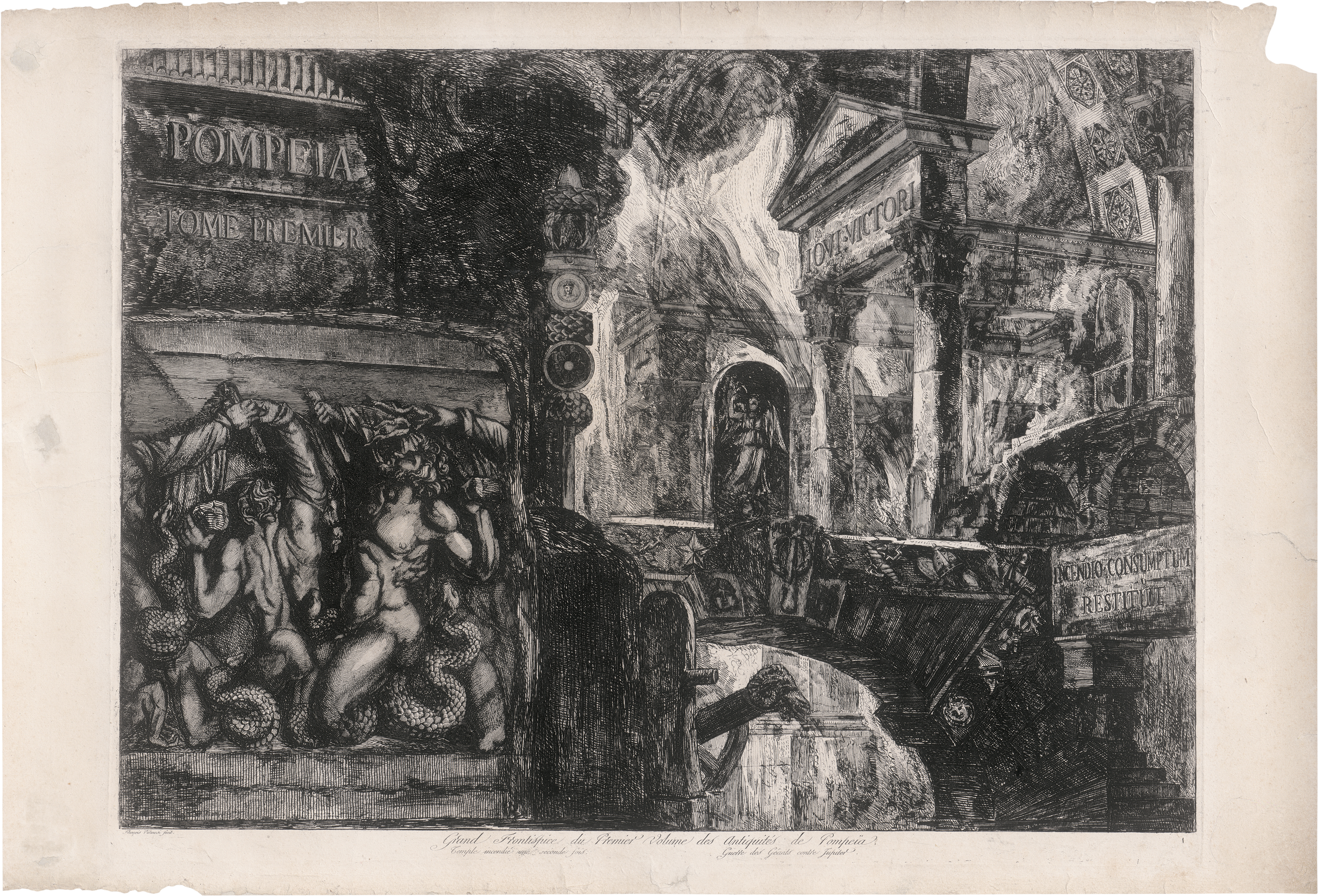 Bei dem beeindruckenden Blatt handelt es sich um das Frontispiz der Antiquités de Pompeia aus der Serie der Antiquités de la Grande Grèce... Das umfangreiche Werk, das schließlich drei Bände und über 100 Tafeln umfassen sollte, basierte auf Zeichnungen, die Vater und Sohn bereits 1770-78 während mehrerer Besuche der Ausgrabungen von Pompeji angefertigt hatten. Das Titelblatt zeigt eine Kombination bildhauerischer und architektonischer Elemente Pompejis, aus deren Mitte Flammen lodern, und gibt den dokumentarischen Zweck der Sammlung an: "INCENDIO CONSUMPTUM RESTITUIT". Ganz ausgezeichneter Druck mit Rand um die Plattenkante. Teils minimal berieben, vollständig aufgezogen, im linken Rand drei größere ausgebesserte Löcher, Ausriss der rechten oberen Ecke im weißen Rand, reparierter Riss im rechten Rand, weitere Randmängel und Löchlein, geringfügig angestaubt und gebrauchsspurig, sonst schön.