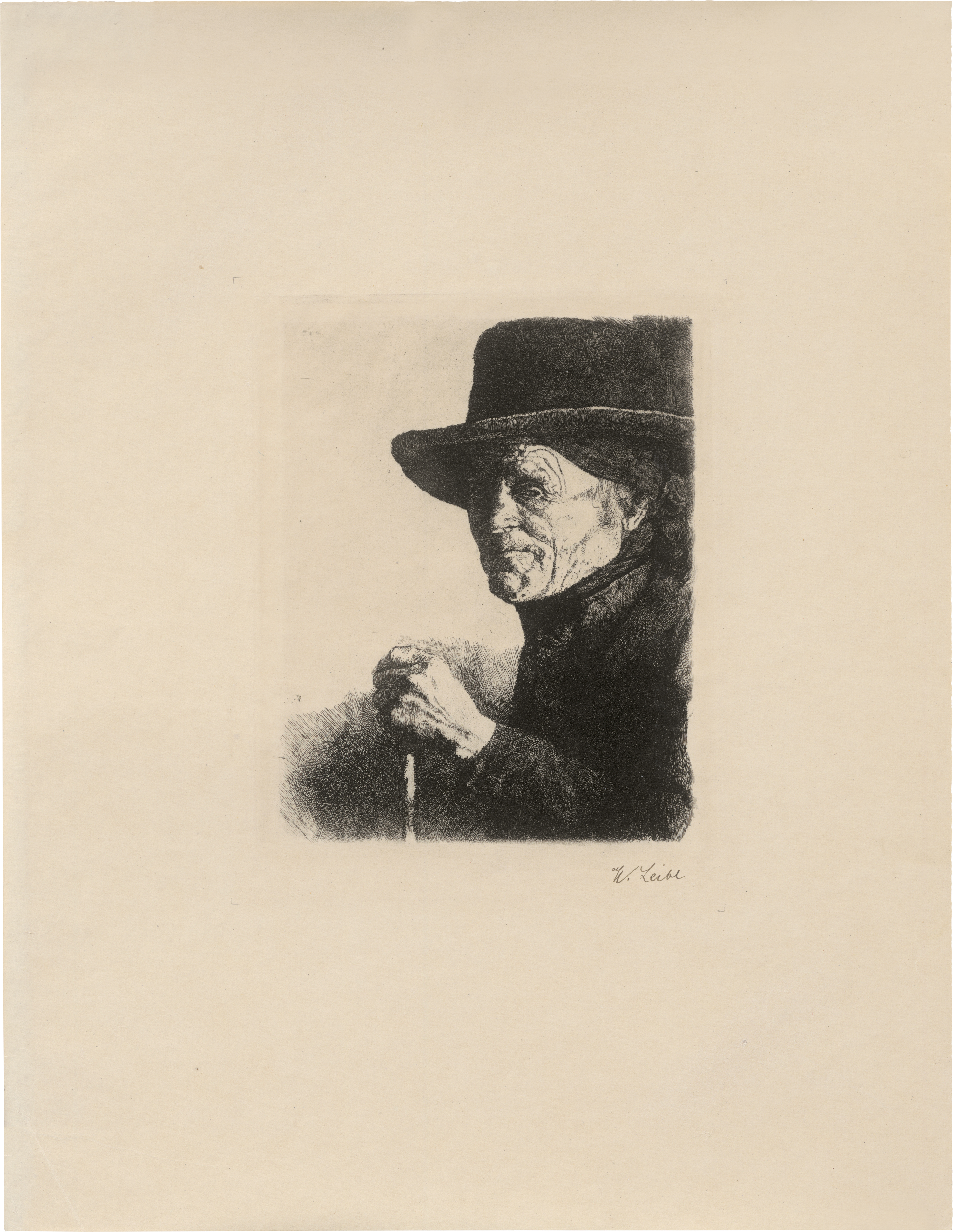 Alter Mann mit Stock (Brustbild einer alten Bäuerin, auf einen Stock gestützt). Radierung auf Similijapan. 14,5 x 11,9 cm. Um 1875/77. Unten rechts in brauner Feder signiert "W. Leibl". Gronau 10, Billeter 12 I (von II).