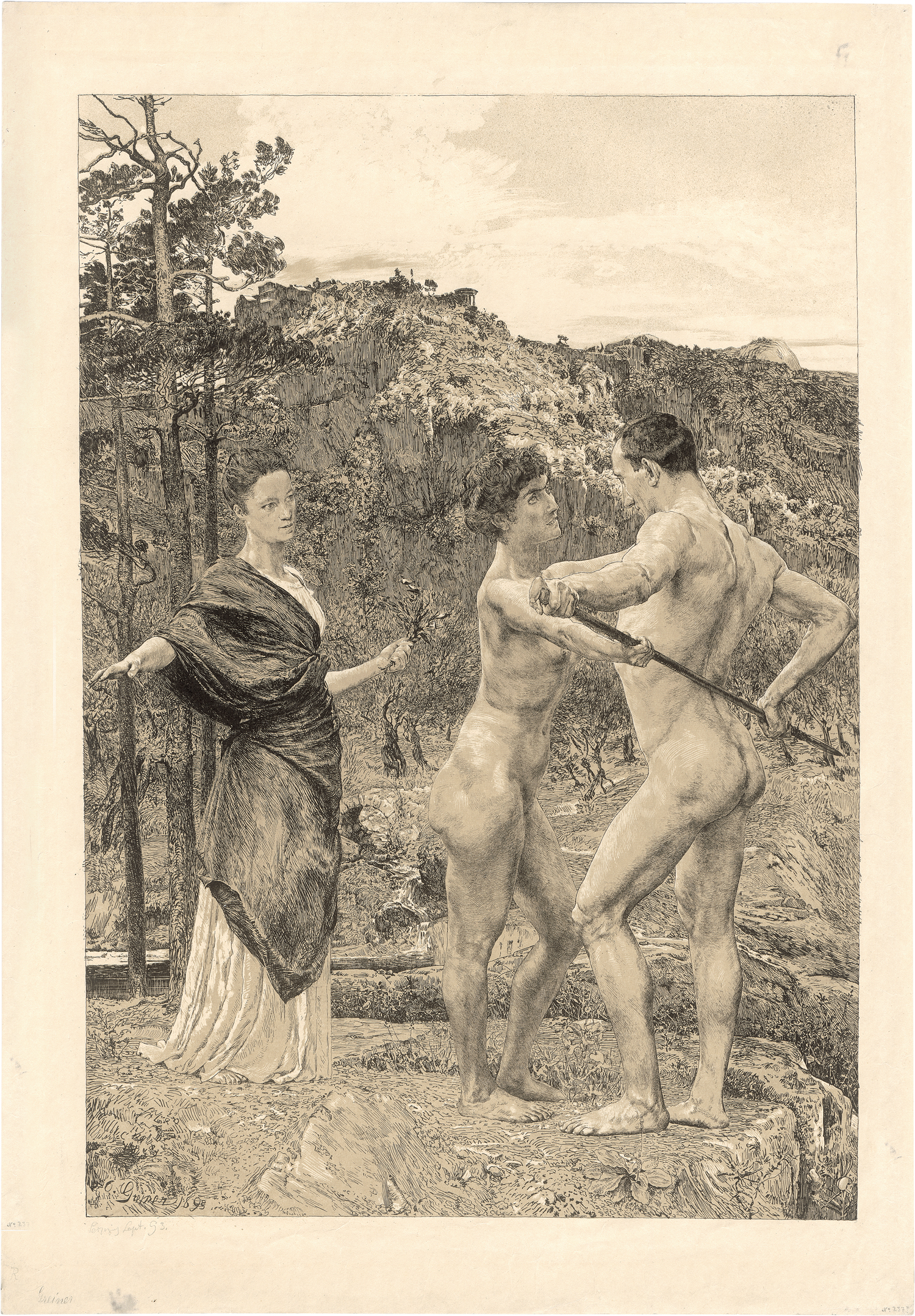 Herakles am Scheidewege. Lithographie mit gelblich-brauner Tonplatte auf Similijapan. 48,5 x 33,7 cm. Eigenh. bez. "Leipzig Sept. 93". 1893. Vogel 49 II.