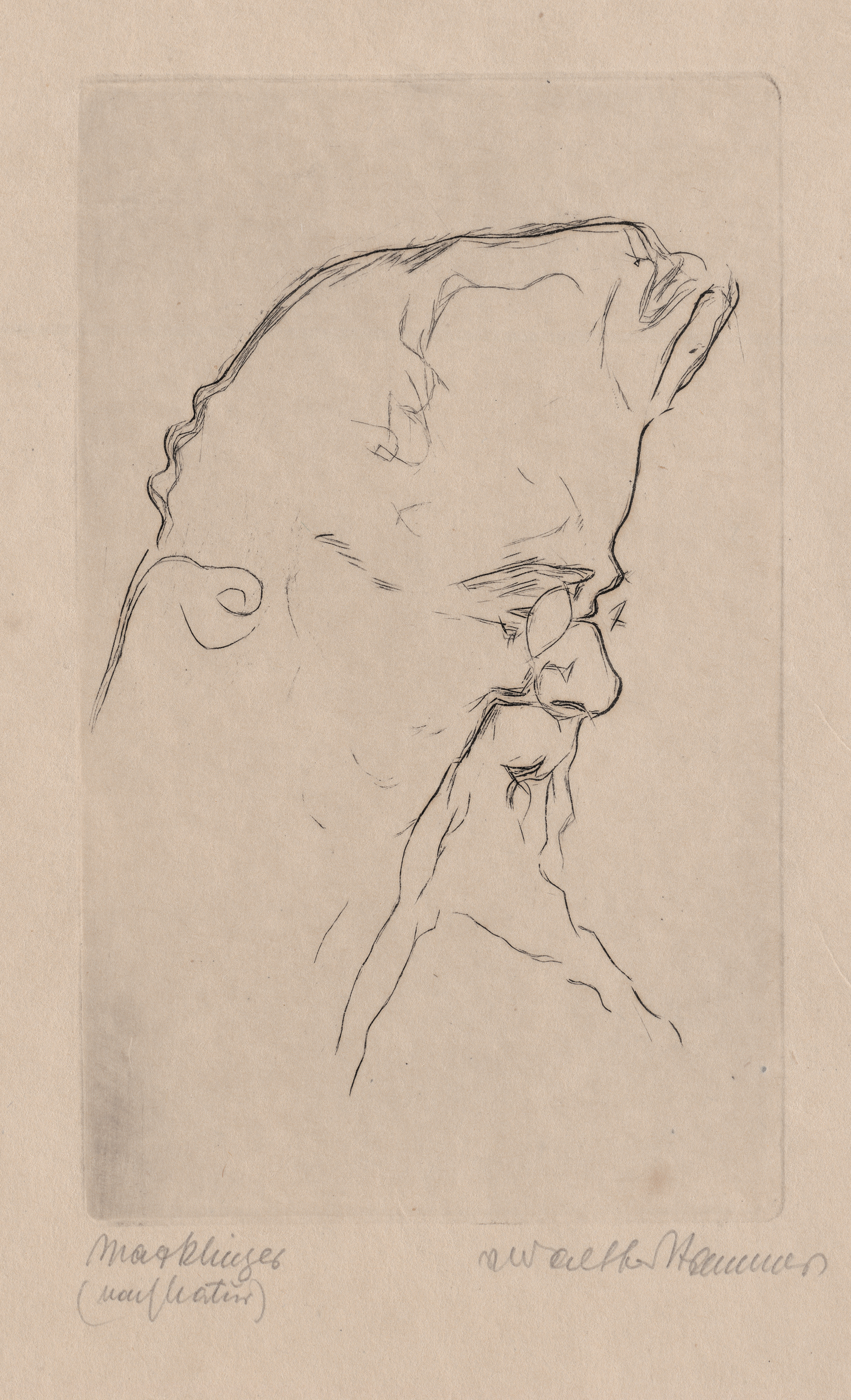 Max Klinger im Dreiviertelpofil nach rechts. Radierung auf Similijapan. 15,9 x 9,8 cm. Signiert und bezeichnet "Max Klinger (nach Natur) / Walther Hammer".