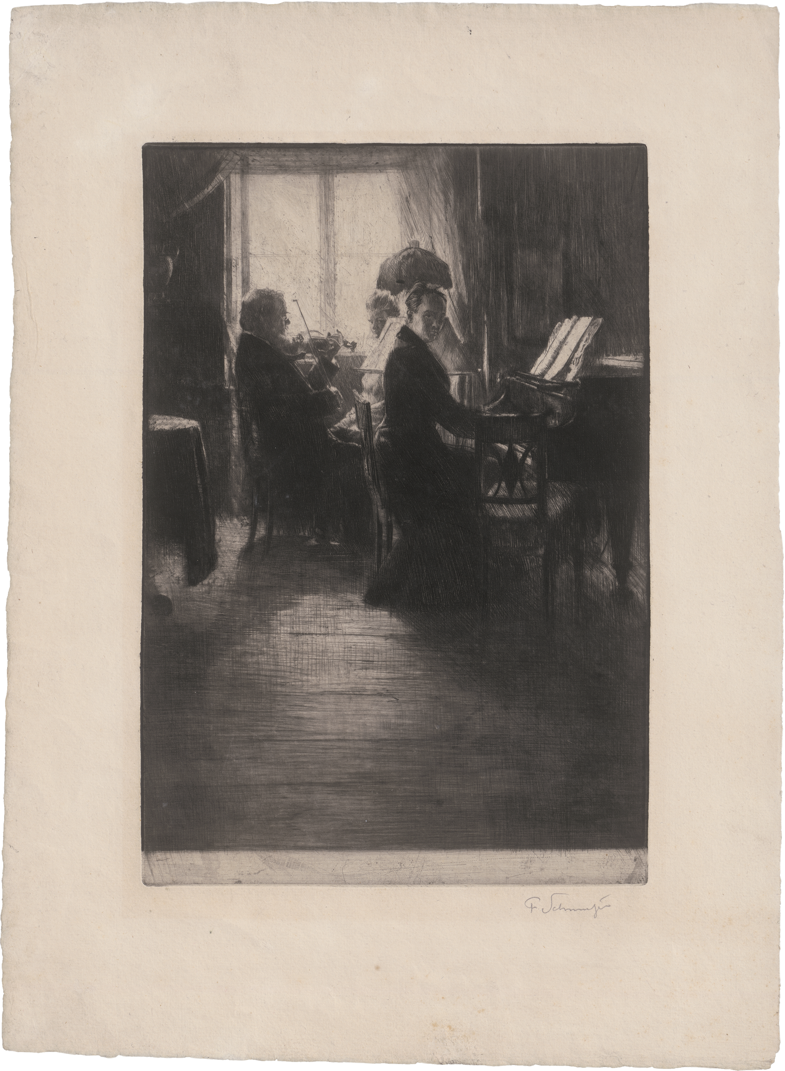 Joachim und Exzellenz V. Keudell, musizierend. Radierung. 28,2 x 19 cm. (1907). Unten rechts signiert "F. Schmutzer". Weixelgärtner 108 IV. Wz. Buchstaben MBM.