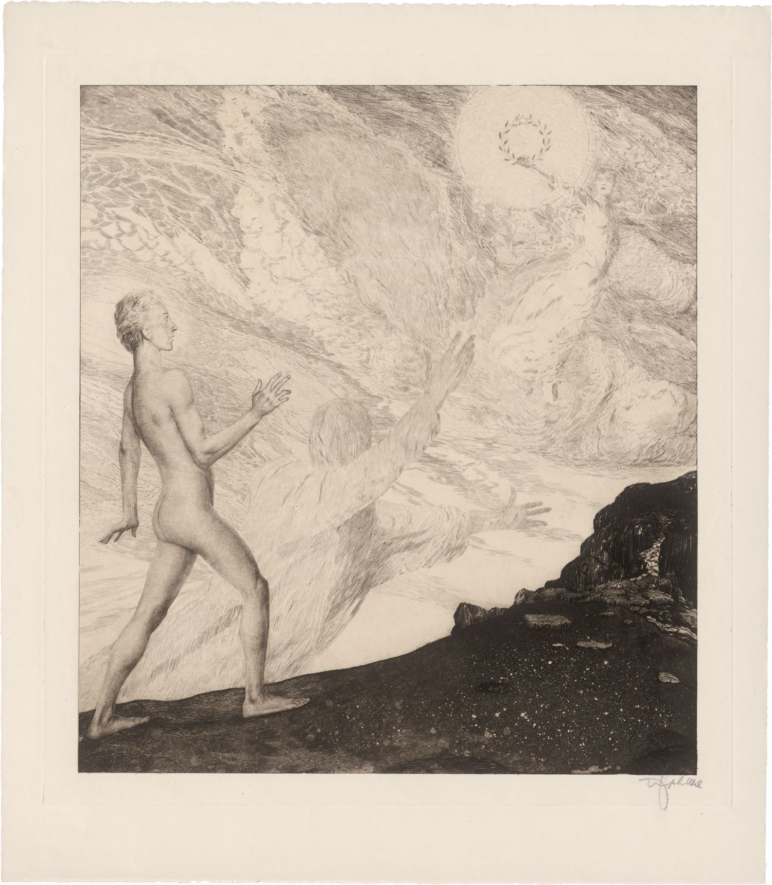 Ad Astra. Radierung, Kaltnadel und Aquatinta in Braunschwarz auf Velin. 35,8 x 35 cm. Signiert. (1921). Matuszak 4668. Wz. Blume.