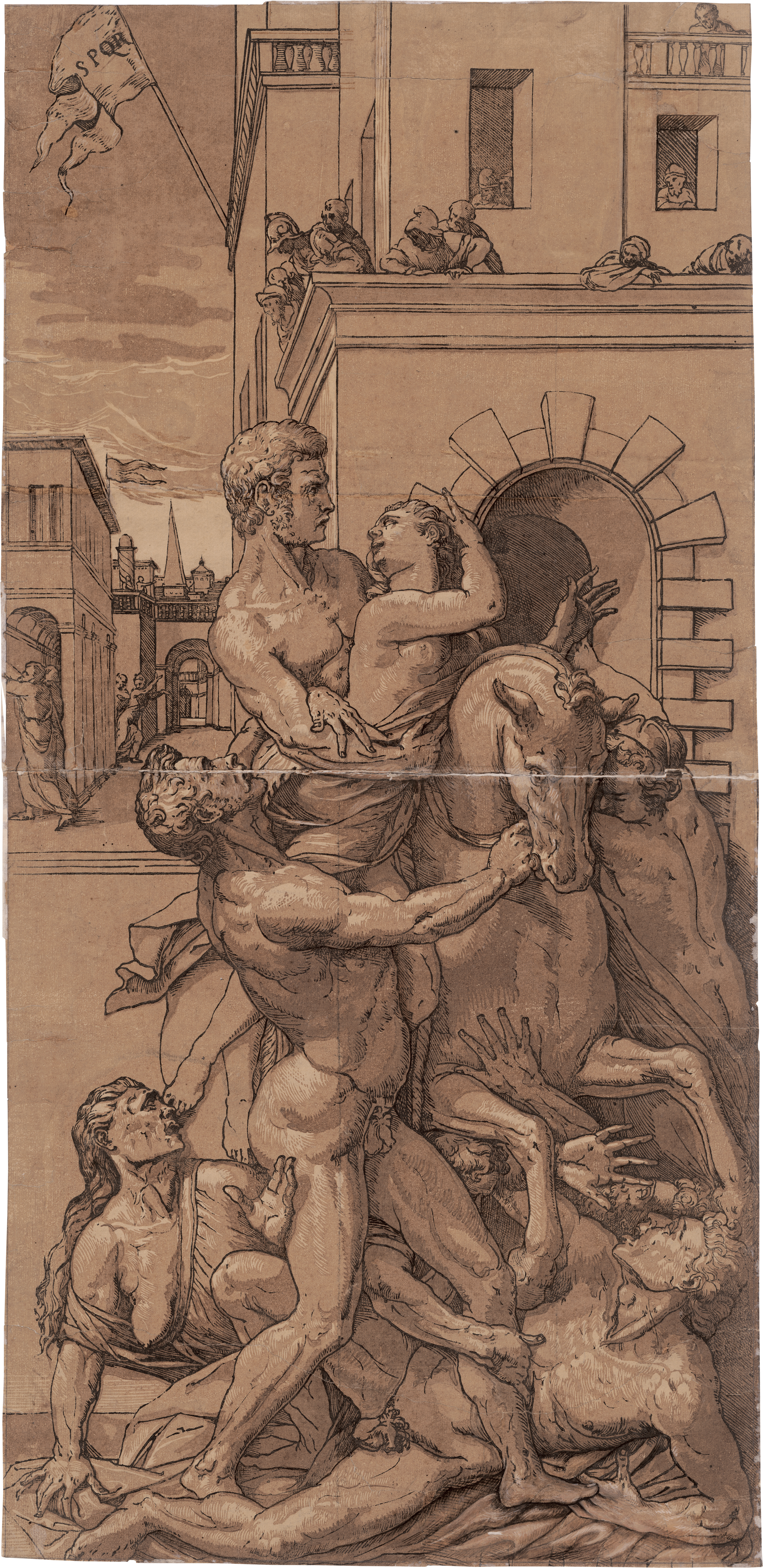 Der Raub der Sabinerinnen (rechte Partie). Clair-obscur-Holzschnitt von vier Blöcken auf zwei zusammengefügten Papierbögen, nach Giambologna. (1585). B. XII, S. 94, 4 wohl I (von II), Rachel A. Young: "Andrea Andreani's Abduction of the Sabine Women after Giambologna", in: Print Quarterly, XLI (2024), Nr. 4, wohl IV (von V). Wz. Adler im Kreis.