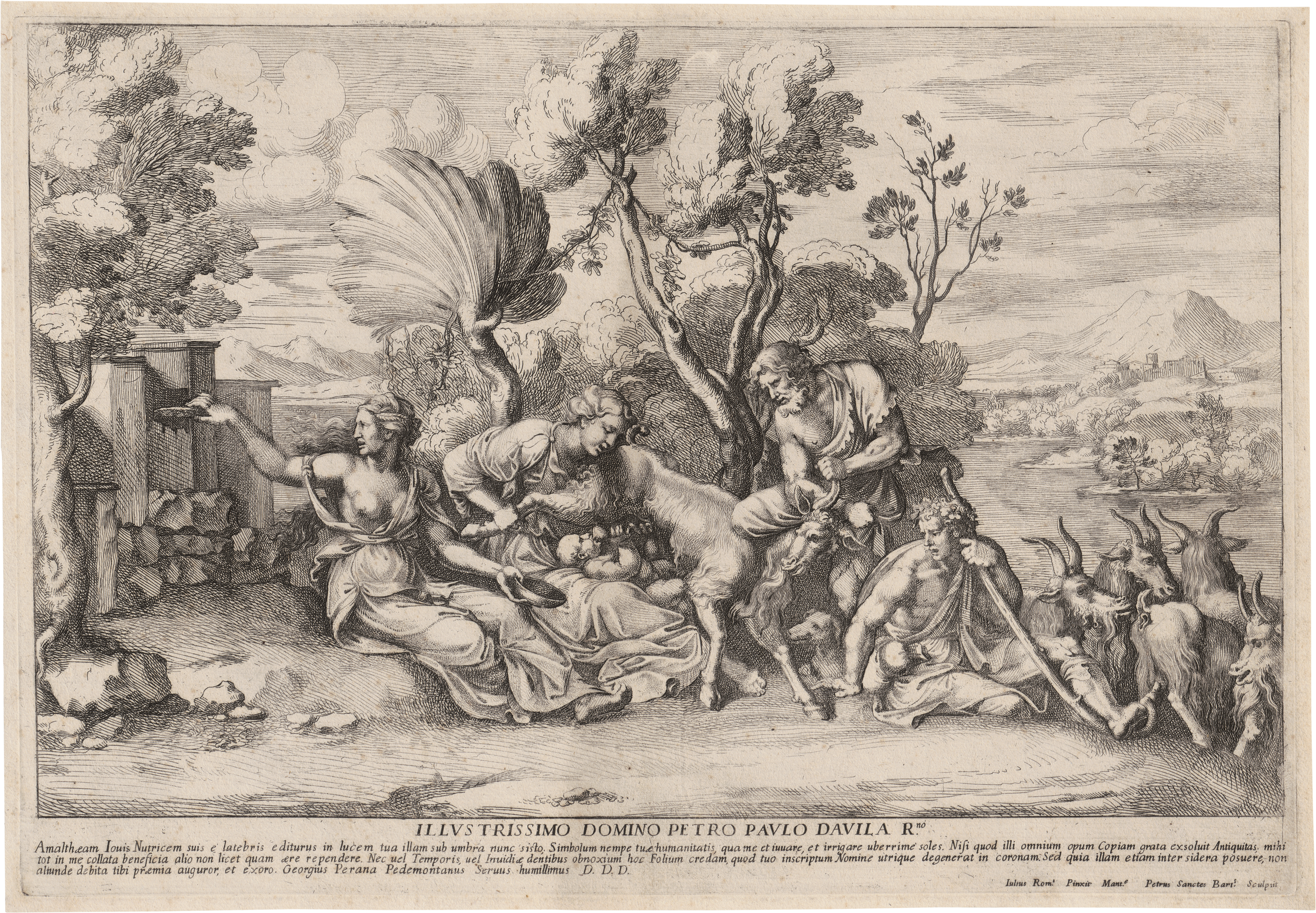 Die Geburt Jupiters, oder: Jupiter säugt an der Ziege Amaltheia. Radierung. 25 x 36,2 cm. Meyer, Allgem. Künstler-Lex., III, 1005. Wz. Anker im Kreis.