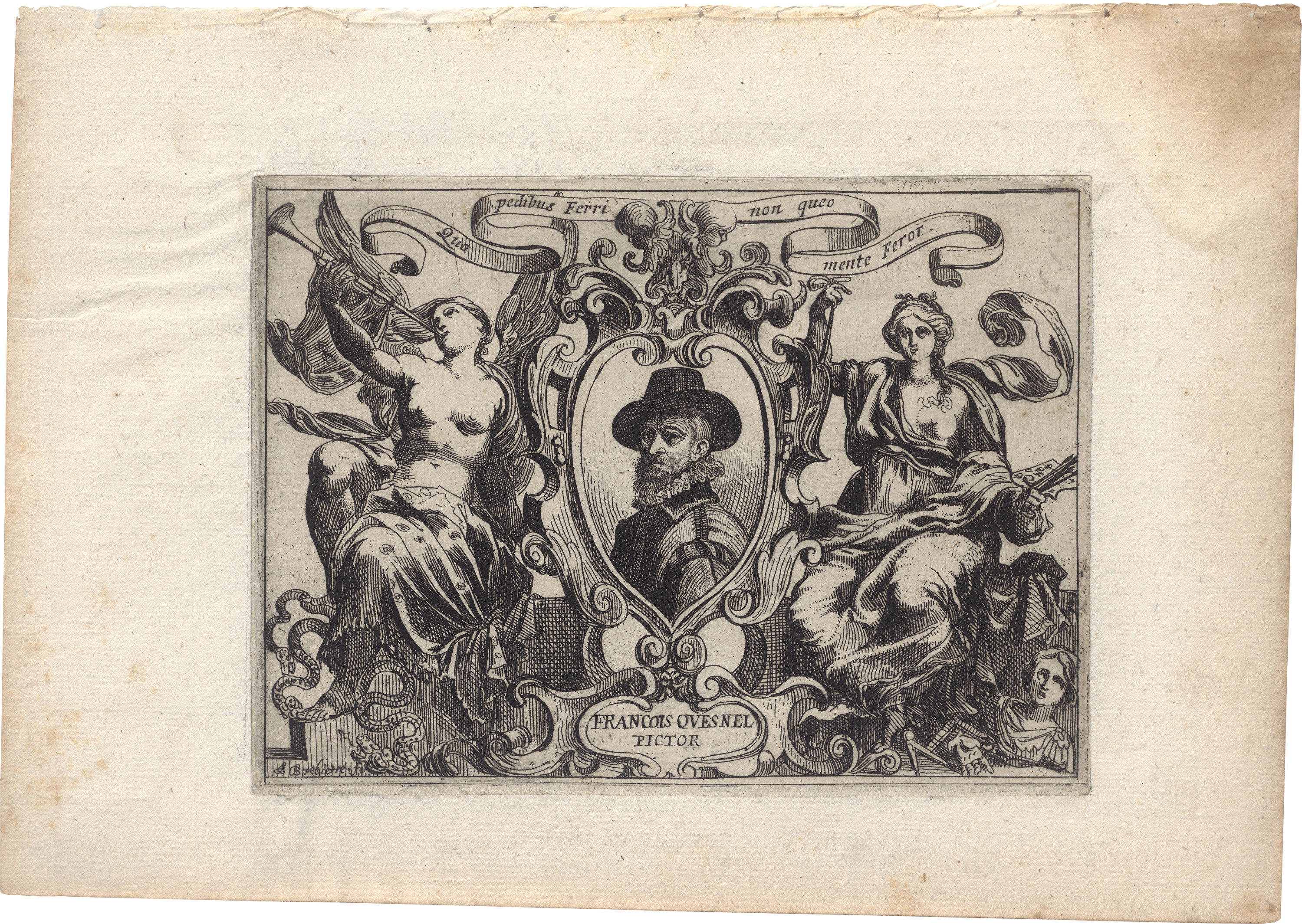 Bildnis François Quesnel I. im Wappenschild gehalten von Fama und Pictura. Radierung. 11,3 x 15,5 cm. (1617). Le Blanc 131, IFF 216.