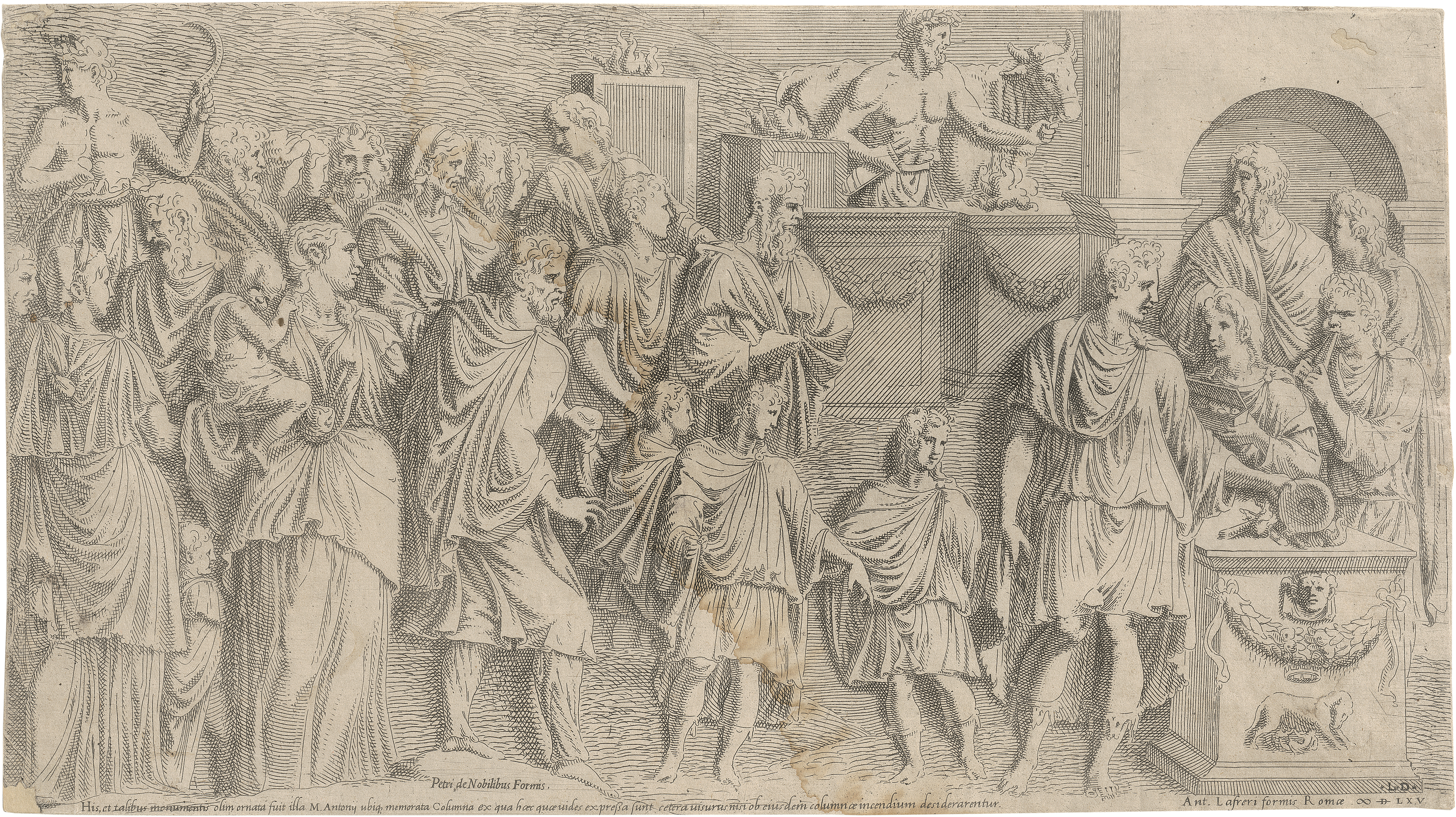 Nach einem Relief auf der Trajanssäule in Rom. Ausgezeichneter, gleichmäßiger Druck mit der Adresse von Pietro de' Nobili. Bis an die Plattenkante bzw. unten die Schrift beschnitten. Ein diagonal verlaufender Wasserfleck in der Mitte, die untere linke Eckenspitze fehlend, hinterlegte Wurmgänge in den oberen Ecken, weitere Löchlein etwa im Arm des Kindes links, in der Lupa vorne rechts eine unscheinbare, hinterlegte Läsur, punktuell montiert, weitere kleine Mängel, sonst gleichwohl gutes Exemplar.