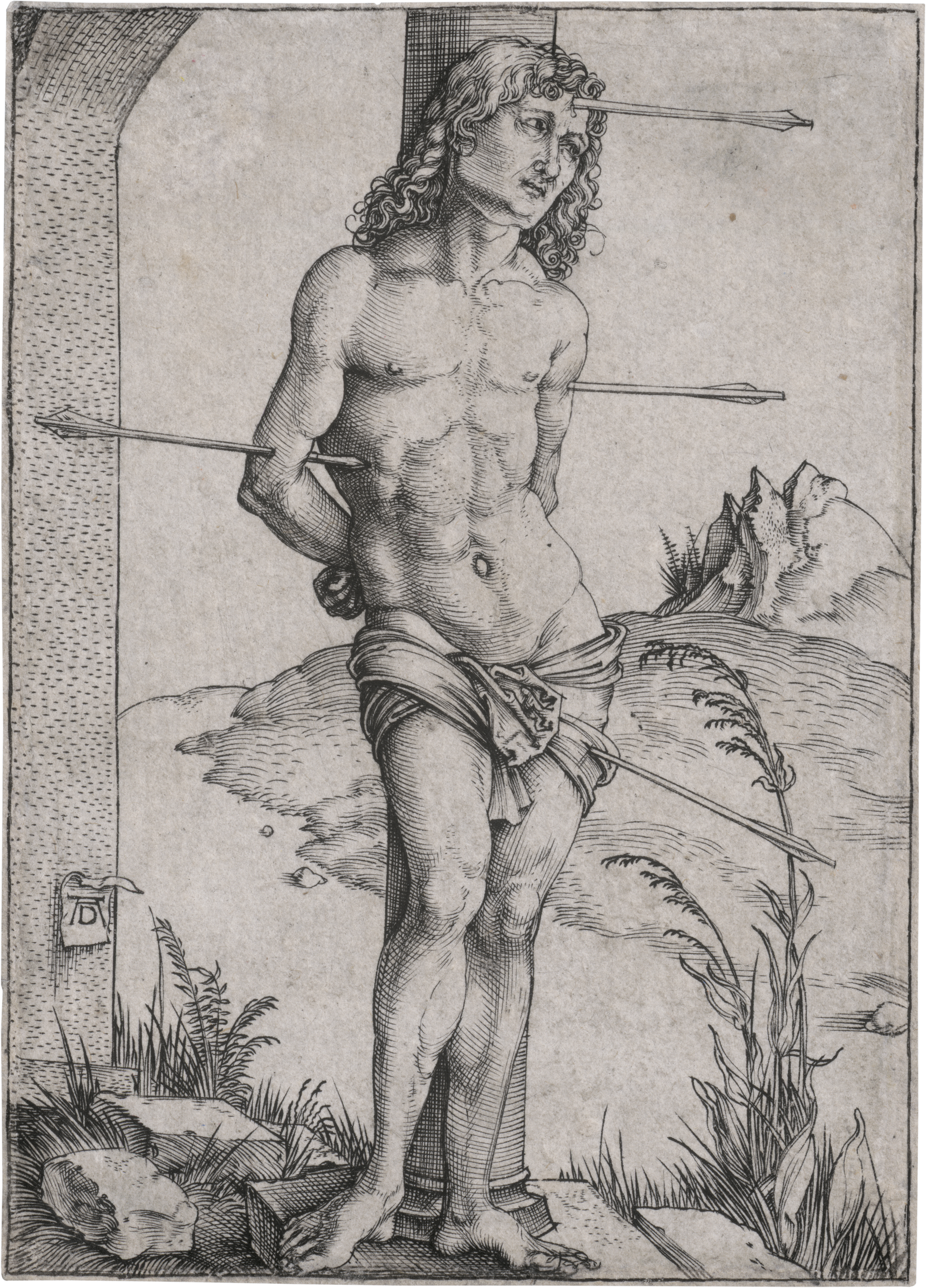 Der hl. Sebastian an der Säule. Kupferstich. 10,8 x 7,8 cm. (1498/99). B. 56, Meder 61 I (von II b).
