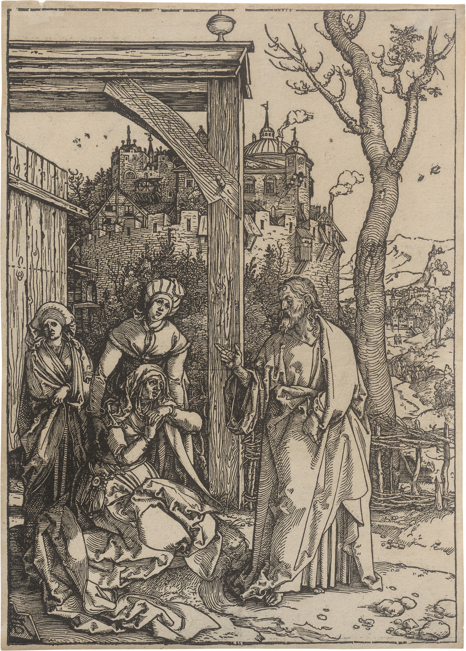 Christi Abschied von seiner Mutter. Holzschnitt. 29,9 x 21,2 cm. Nach 1507. B. 92, Meder 204, wohl weitere Ausgaben ohne Text g (von h). Wz. Häuschen mit Schlange (Meder 111).