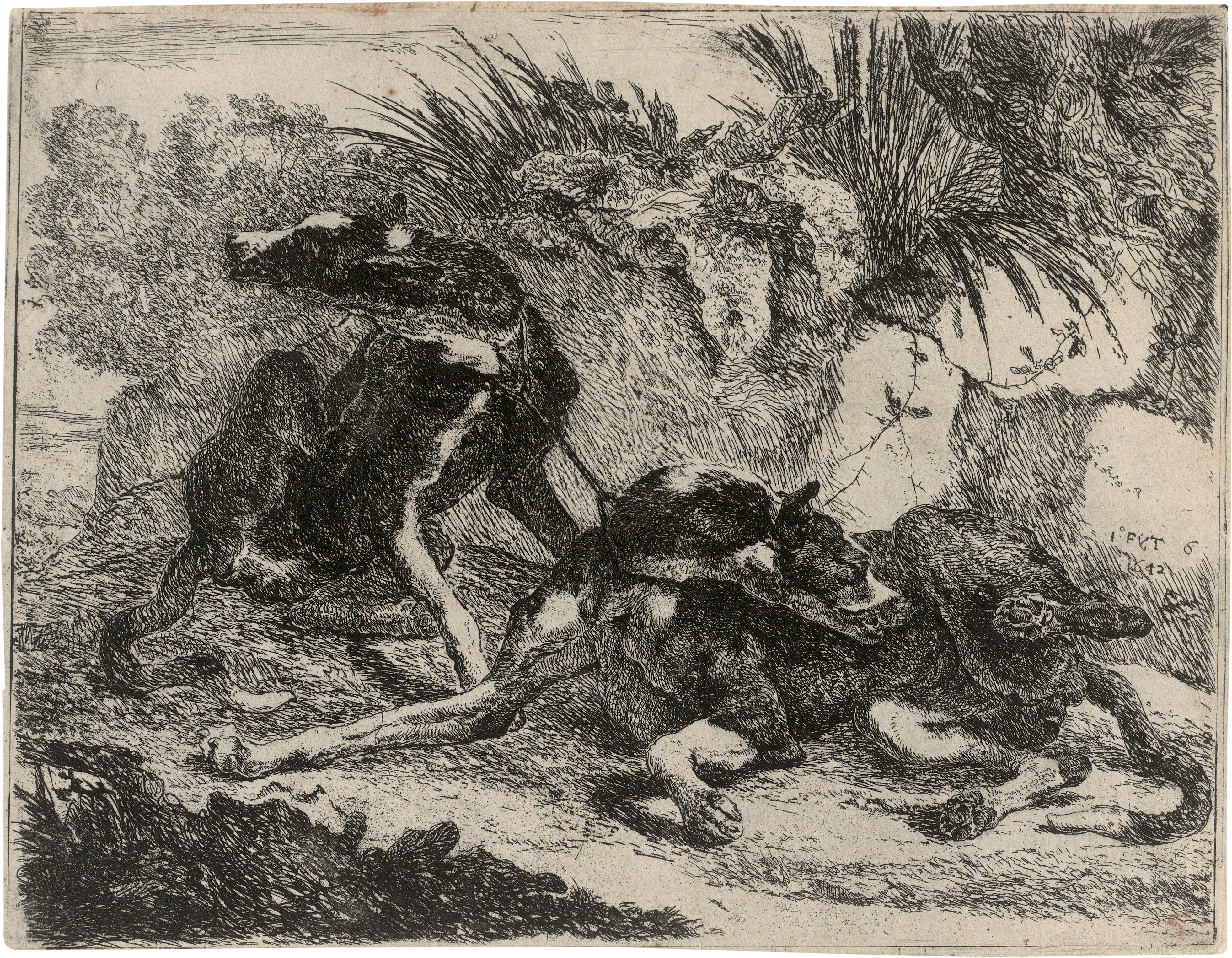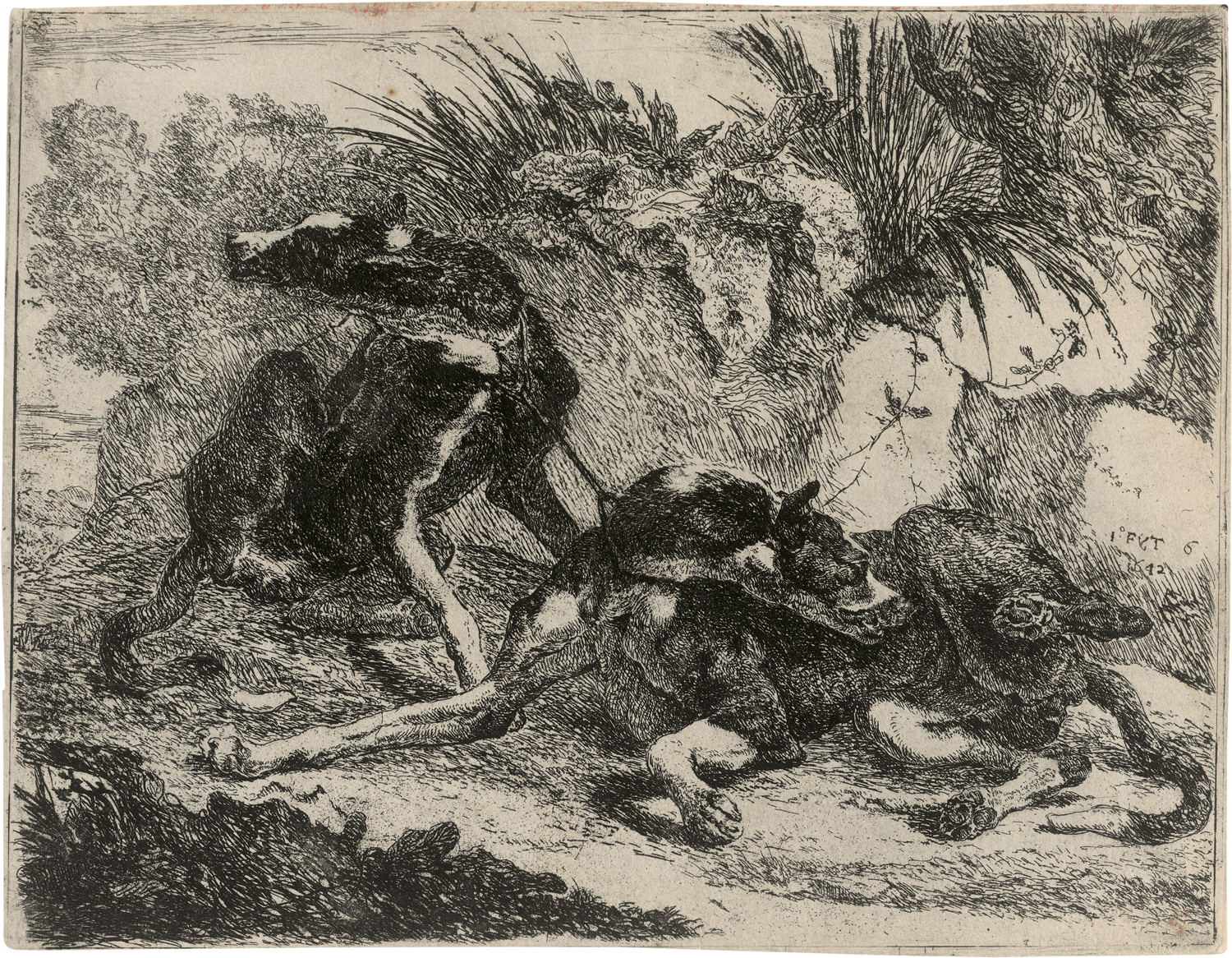 Drei Blatt mit Hunden. 3 (von 8) Radierungen. Je ca. 17,3 x 22 cm. 1642. B. 10, 11 und 15, Hollstein 10, 11 und 5, je II (von VI). Wz. H.14, mit Wappen mit Winkel und drei Halbmonde mit Palmen.