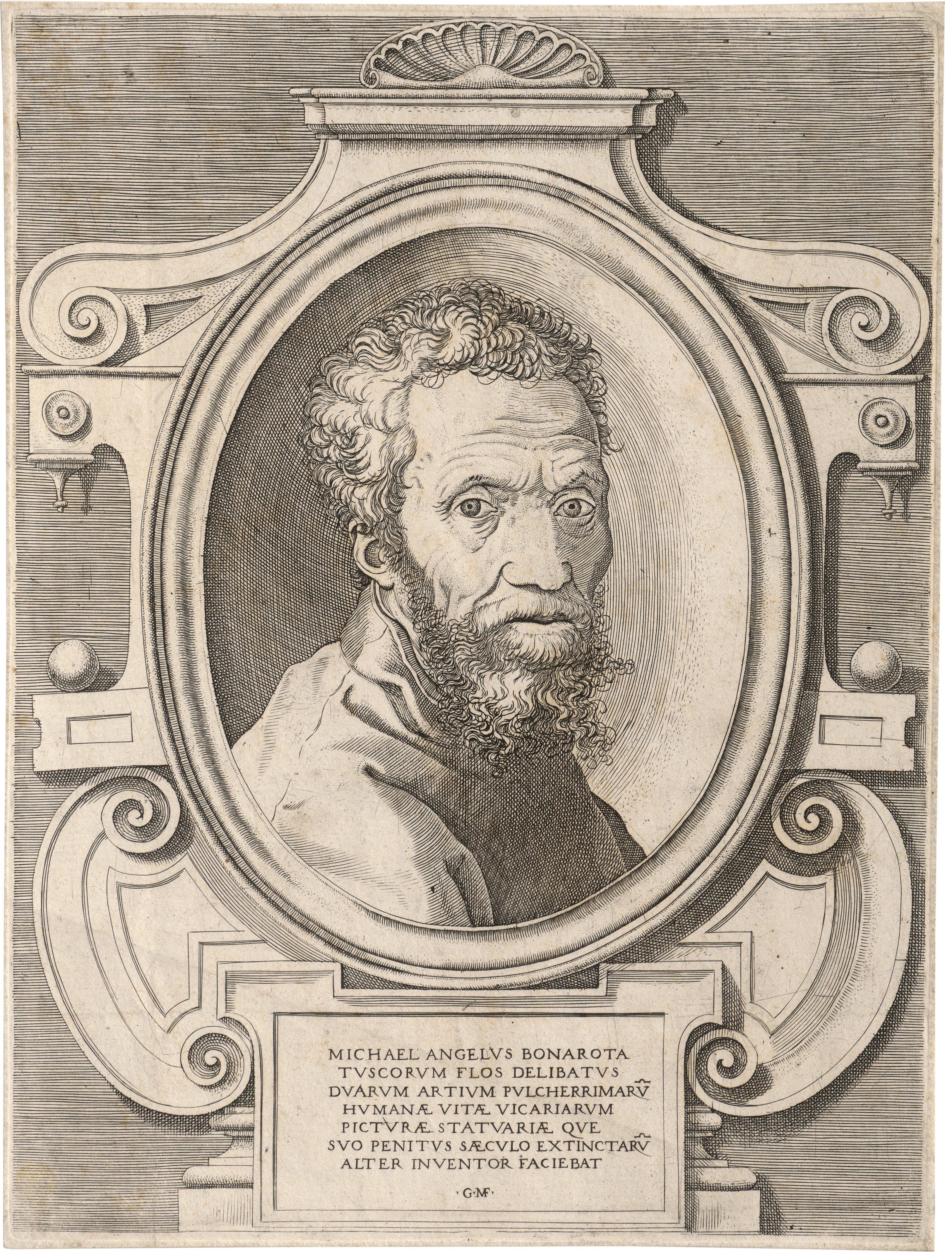 Das lebendige Porträt, das Ghisi nach einer Version Marcello Venustis nach dem um 1545 entstandenen Bildnis von Jacopino del Conte gestochen hat, zeigt Michelangelo im Alter von etwa 70 Jahren, kurz nachdem die Arbeiten am Jüngsten Gericht in der Sixtinischen Kapelle abgeschlossen waren. Laut der angebrachten Inschrift fertigte Ghisi die Darstellung kurz nach Michelangelos Tod, also 1564. - Ausgezeichneter, gleichmäßiger Druck mit feinem Rändchen um die Plattenkante. Geglättete Vertikalfalte links und Horizontalfalte unten, dort auch mit einer Diagonalfalte, weitere Alters- und Handhabungsspuren, insgesamt aber gut erhalten.