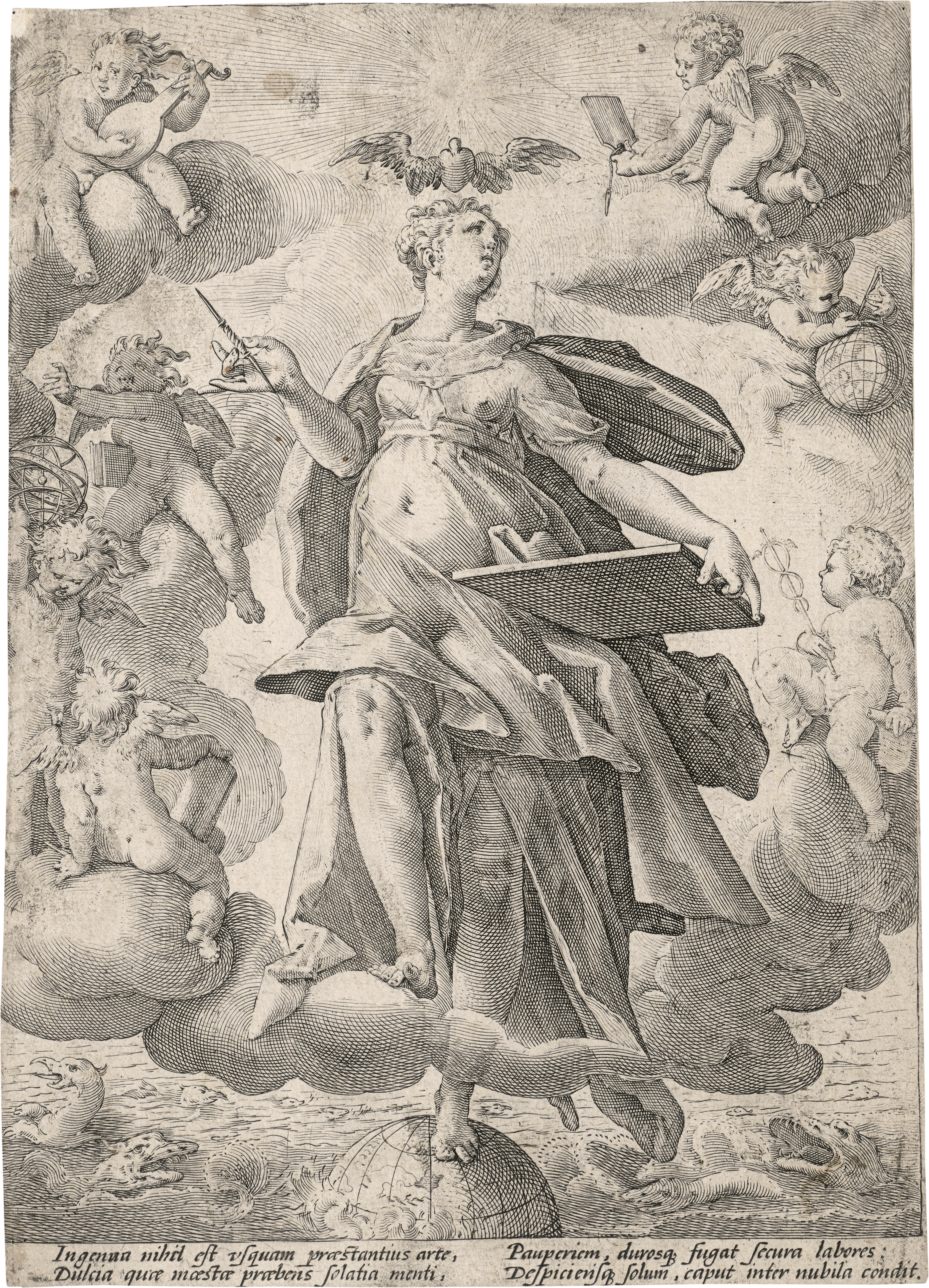 Werkstatt. Allegorie der Zeichnung mit den Sieben Freien Künste. Kupferstich. 21,6 x 15,6 cm. Um 1587/88. B. 17, Hollstein (nach Goltzius) 494, Leesberg (New Hollstein) 715 I (von III).