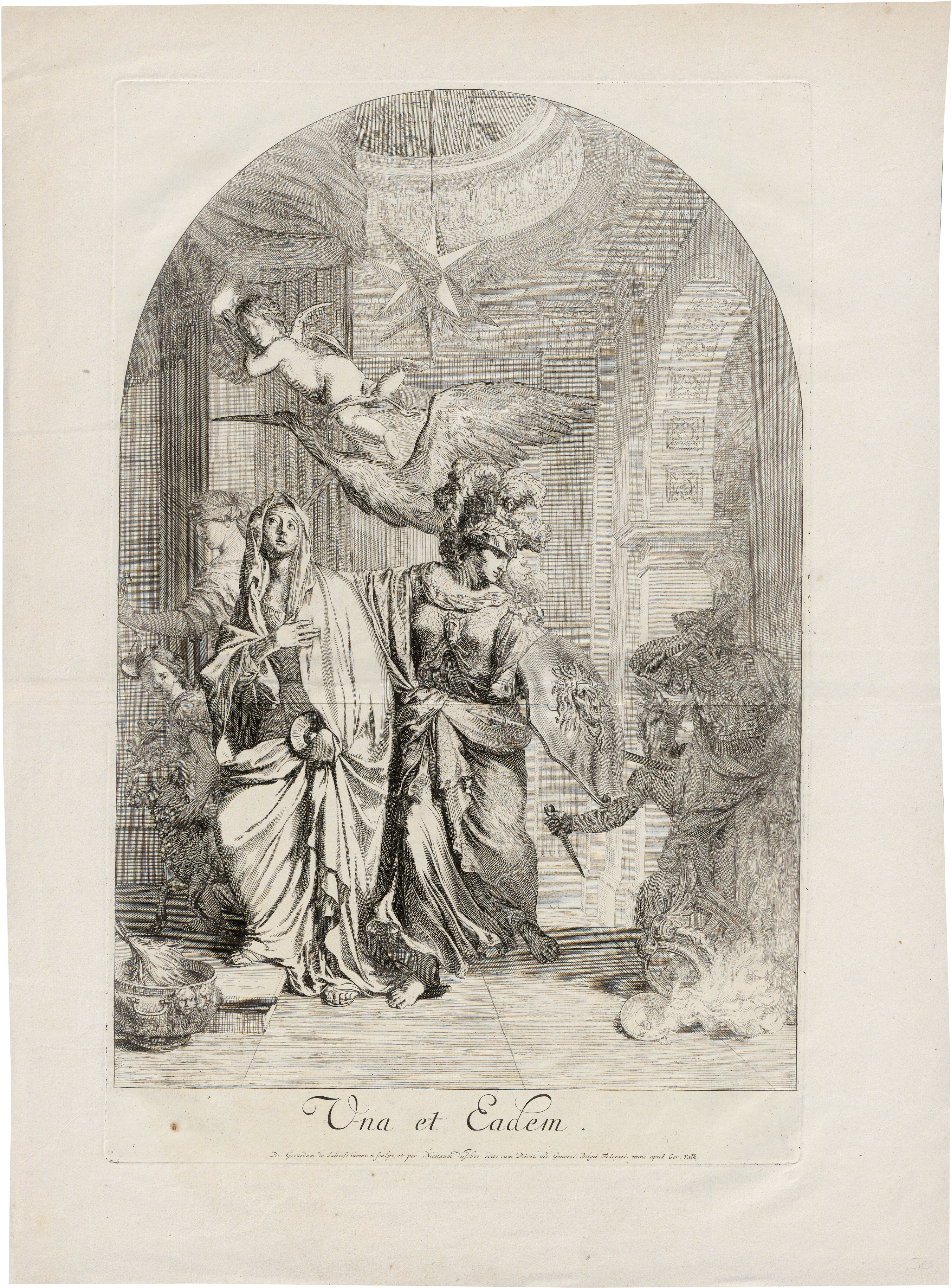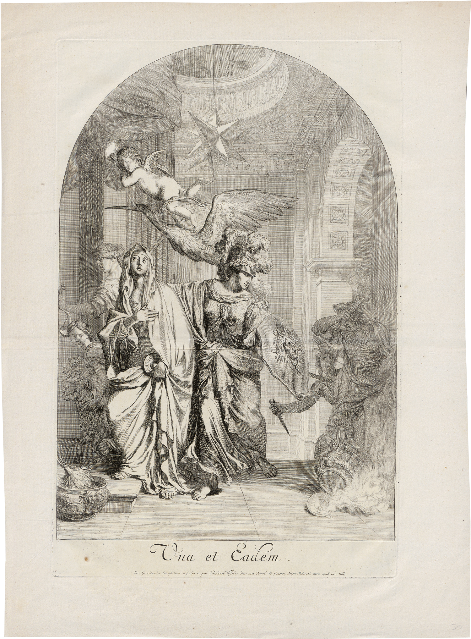 Una et Eadem, oder: Minerva als Beschützerin der Tugenden. Kupferstich und Radierung. 53,1 x 34,3 cm. Um 1677. Hollstein 24, Roy 20 II. Wz. Kreuz im Rosenkranz mit Nebenmarke Schrift.