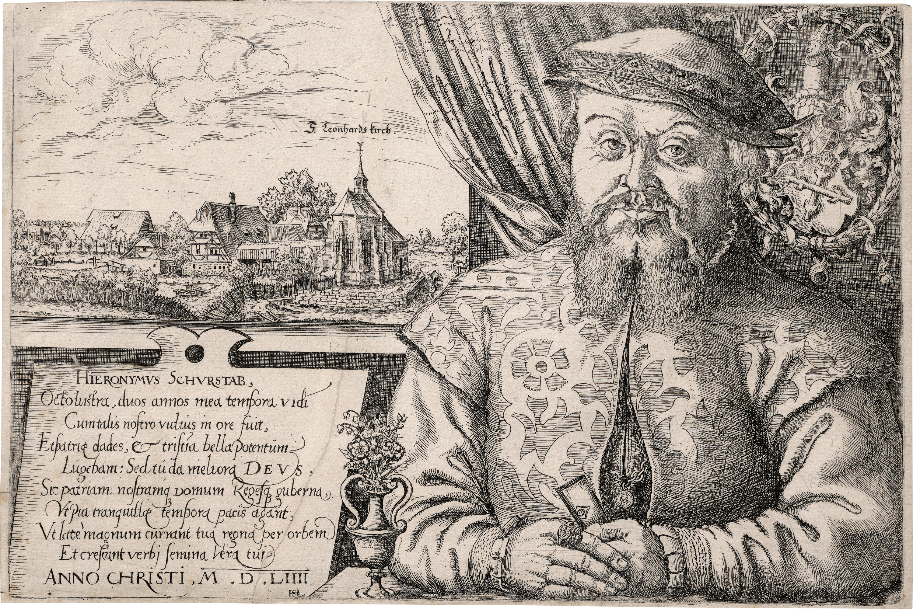 Bildnis Hieronymus Schurstab, Bürgermeister in Nürnberg. Radierung. 19,4 x 29,1 cm. 1547. B. 7, Hollstein 68 II.
