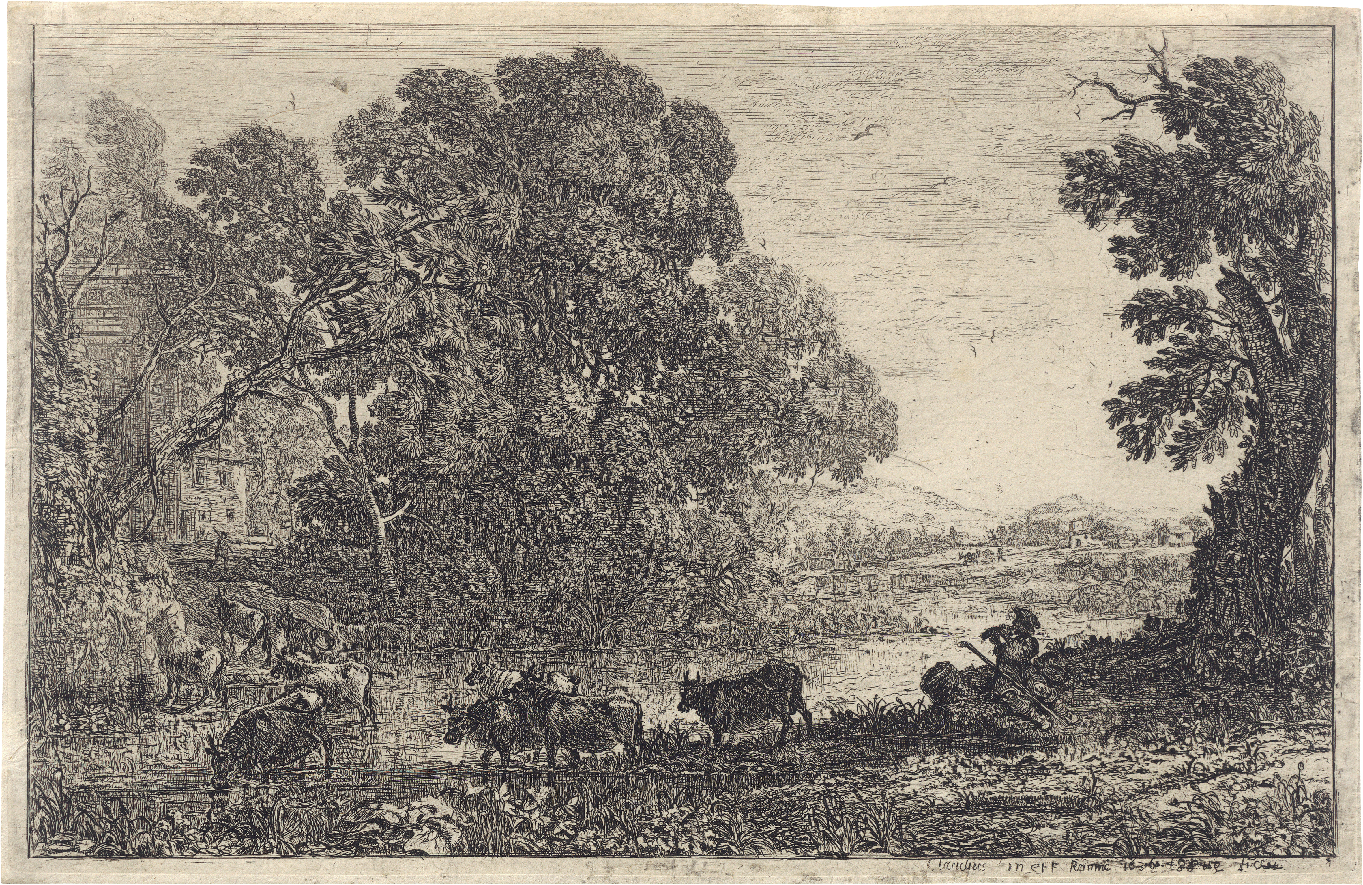 Eines der Hauptblätter Claudes, das zweifellos zu den bedeutendsten Landschaftsdarstellungen des 17. Jahrhunderts zählt. Ausgezeichneter Druck mit feinem Rändchen um die Plattenkante bzw. bis auf diese beschnitten. Minimale Erhaltungsmängel, sonst gutes Exemplar. Aus der Sammlung M. Machanek (Lugt 1775).