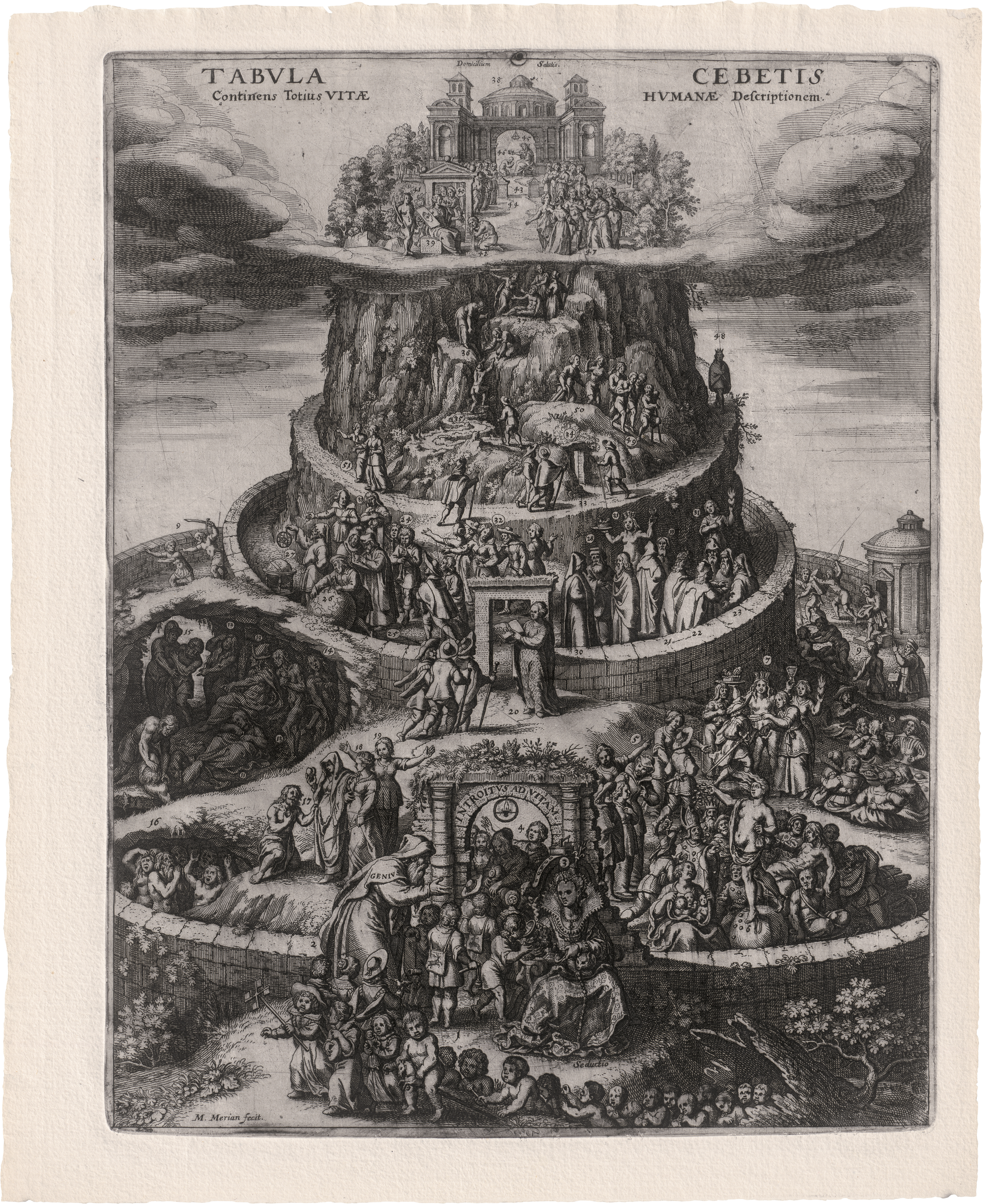 Die "Tabula Cebetis", ein Dialog aus der griechischen Philosophie über den rechten Lebensweg, wurde im 15. Jh. in Italien wiederentdeckt. Bildliche Verarbeitungen des Textes zeigen allegorisch den hindernisreichen Lebensweg des Menschen als geistige Reise hin zur Tugend und wahren Erkenntnis. In Merians Darstellung nimmt der Weg an einer Pforte mit Rundbogen seinen Lauf. Er führt über einen Bergaufstieg, auf dem man u.a. den Tugenden und Sünden begegnet, hinauf zum Garten der Glückseligkeit und der göttlichen Rettung auf der Spitze . Einzelne Figurengruppen sind Mathams Kupferstich nach Goltzius (Hollstein 253) entnommen. Merians Druckplatte ist in der Sammlung der Georg August Universität in Göttingen erhalten (Inv. DP1). - Prachtvoller, überaus markanter, wenngleich später, wohl moderner Druck von der ungereinigten Platte, mit Schöpfrändern. In vorzüglicher Erhaltung. Selten.