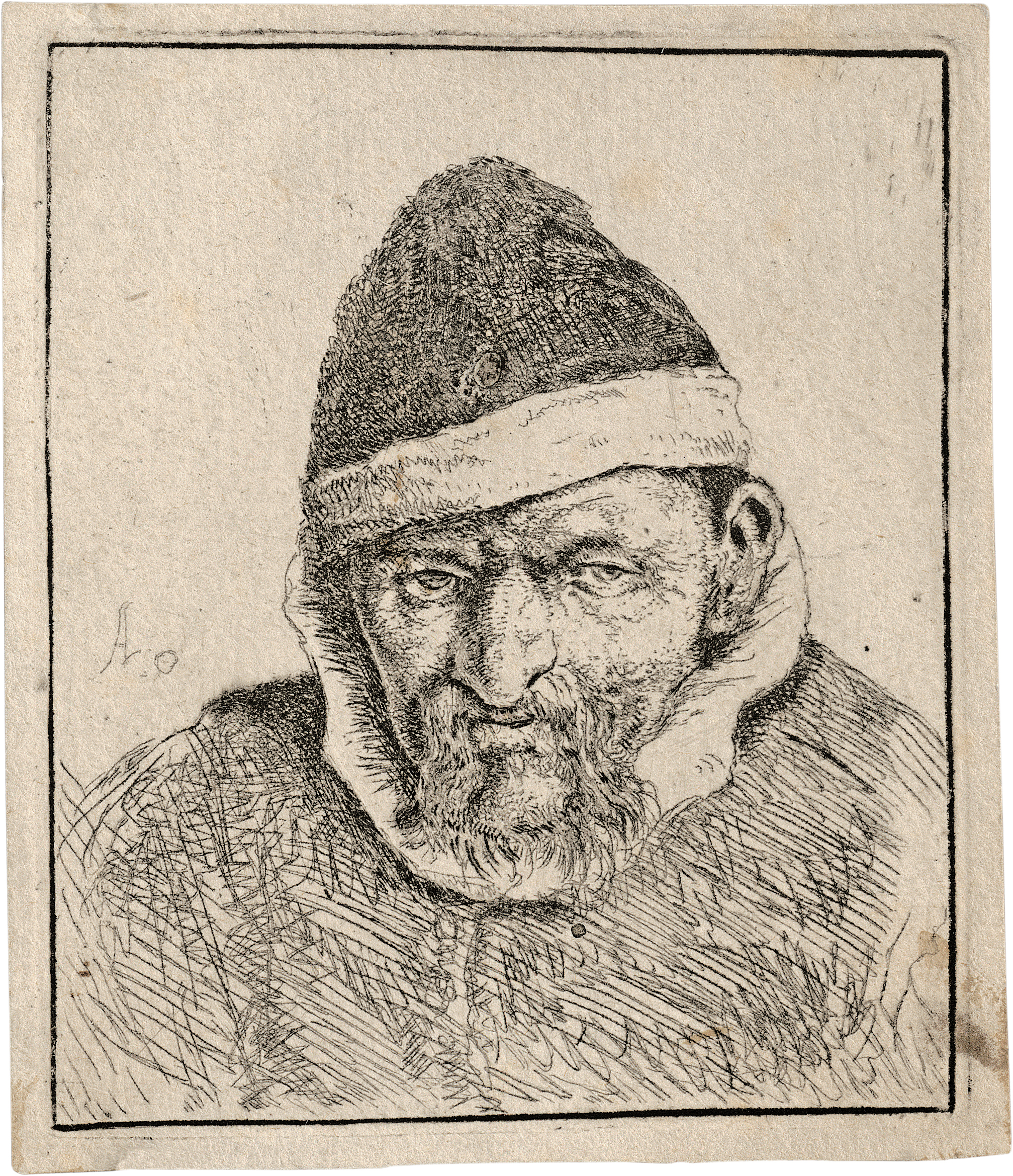 Büste eines Bauern mit spitzer Mütze. Radierung. 7 x 5,9 cm. B. 3, Dutuit, Davidsohn, Godefroy, Hollstein 3 VII, Giordani/Rutgers (New Hollstein) 12 VII.