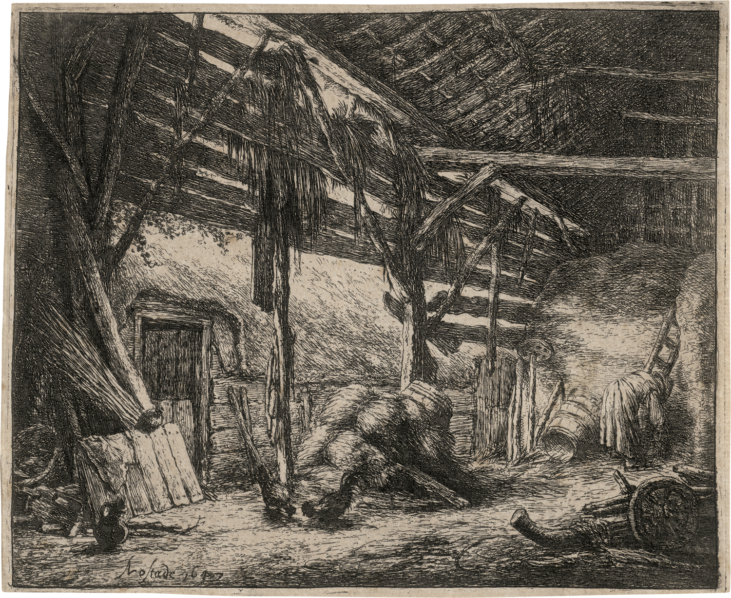 Die Scheune. Radierung. 15,7 x 19,3 cm. 1647. B. 23, Dutuit VI, Davidsohn, Godefroy, Hollstein 23 X, Giordani/Rutgers (New Hollstein) 5 VIII. Wz. Kleine Kartusche mit Paris und 1680.