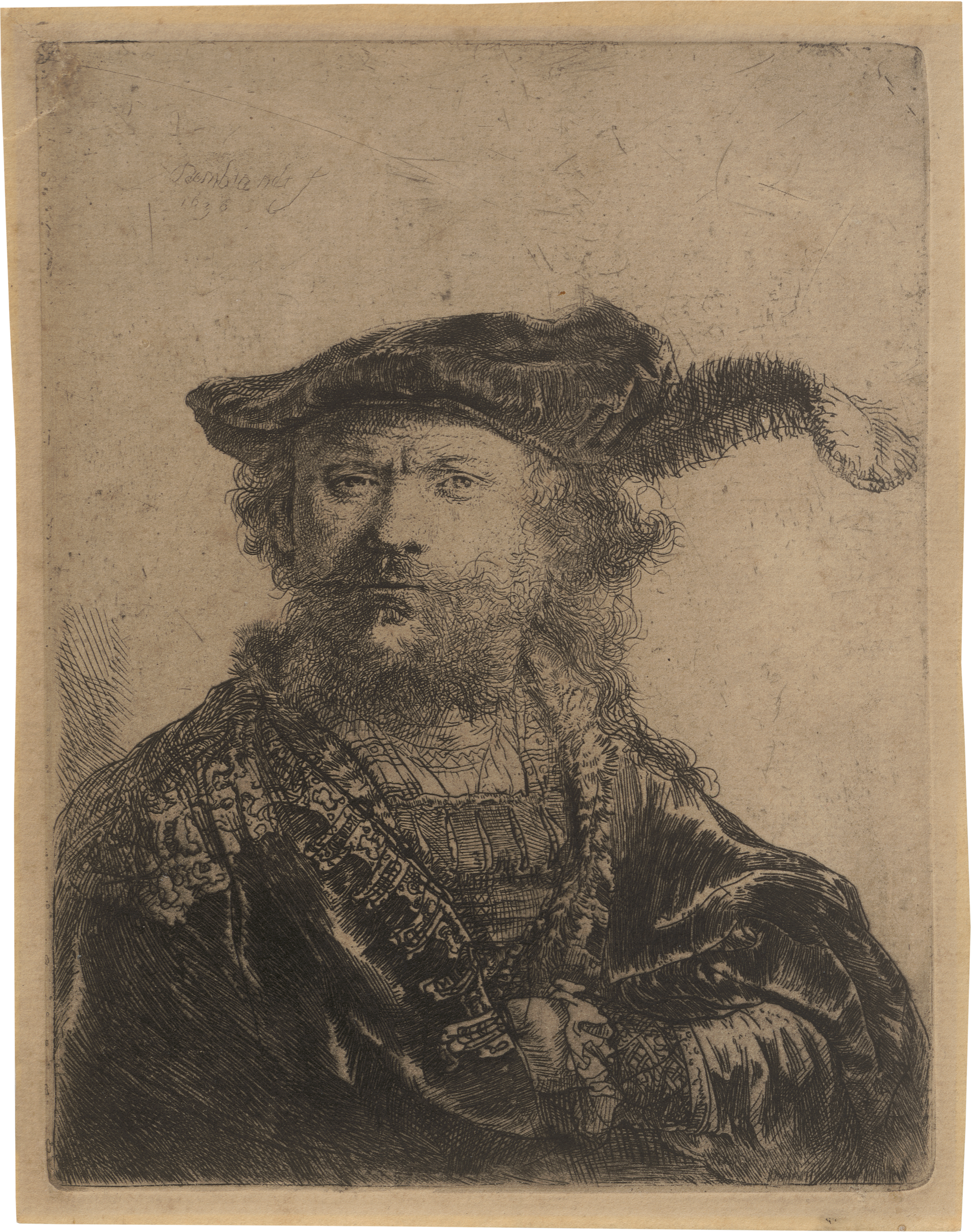 Selbstbildnis mit federgeschmücktem Barett. Radierung. 13,5 x 10,4 cm. 1638. B. 20, White/Boon (Hollstein) 20, Nowell-Usticke 20 III, Hinterding/Rutgers (New Hollstein) 170 IV.