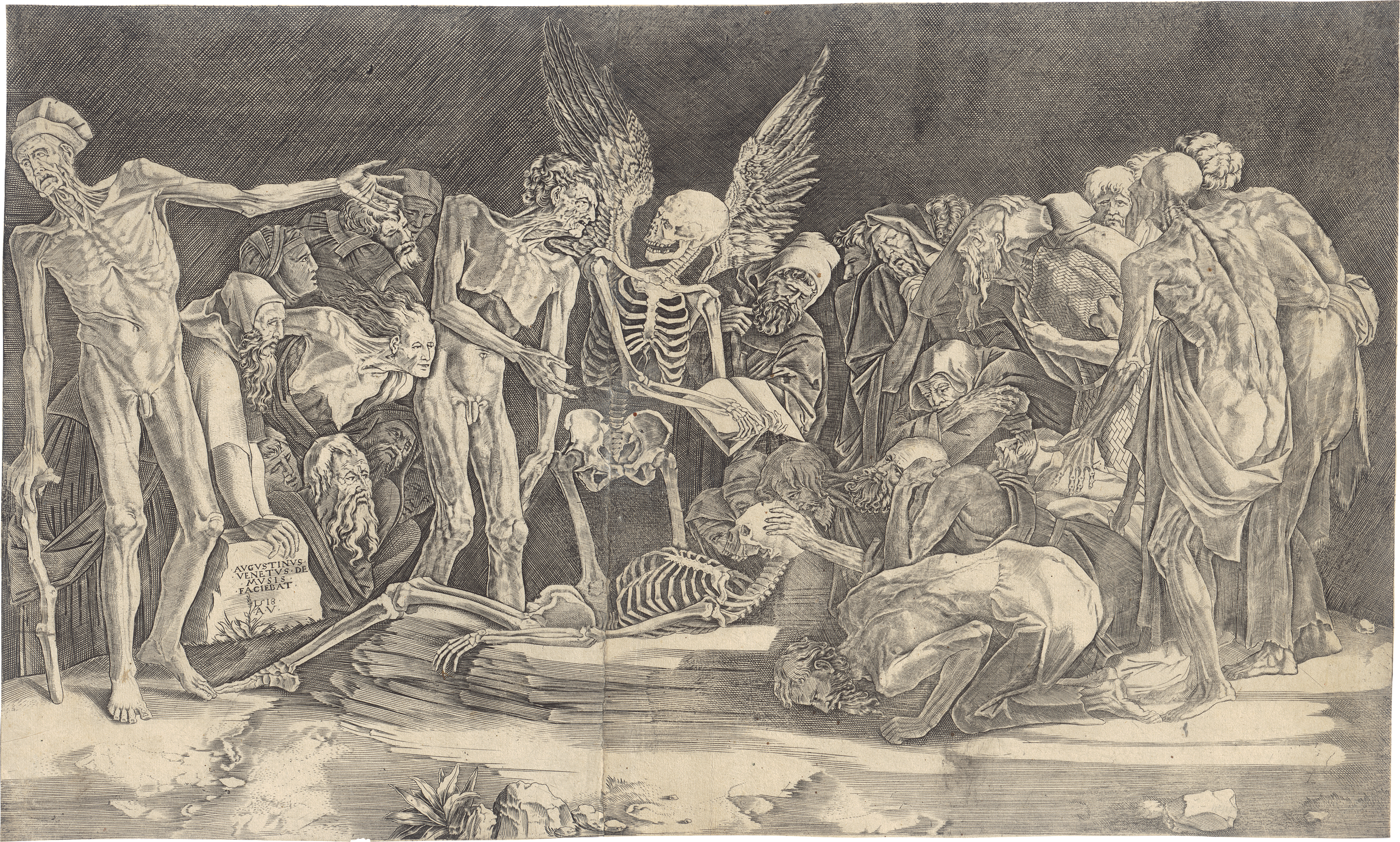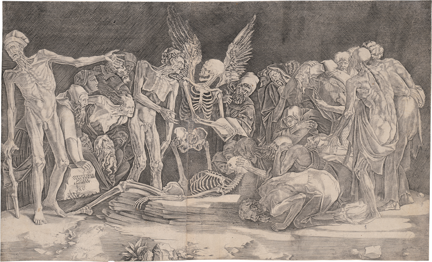 Die Skelette. Kupferstich nach Baccio Bandinelli. 28,7 x 43,3 cm. 1518. B. (Raimondi) XIV, 320, 424. Wz. Wäppchen.