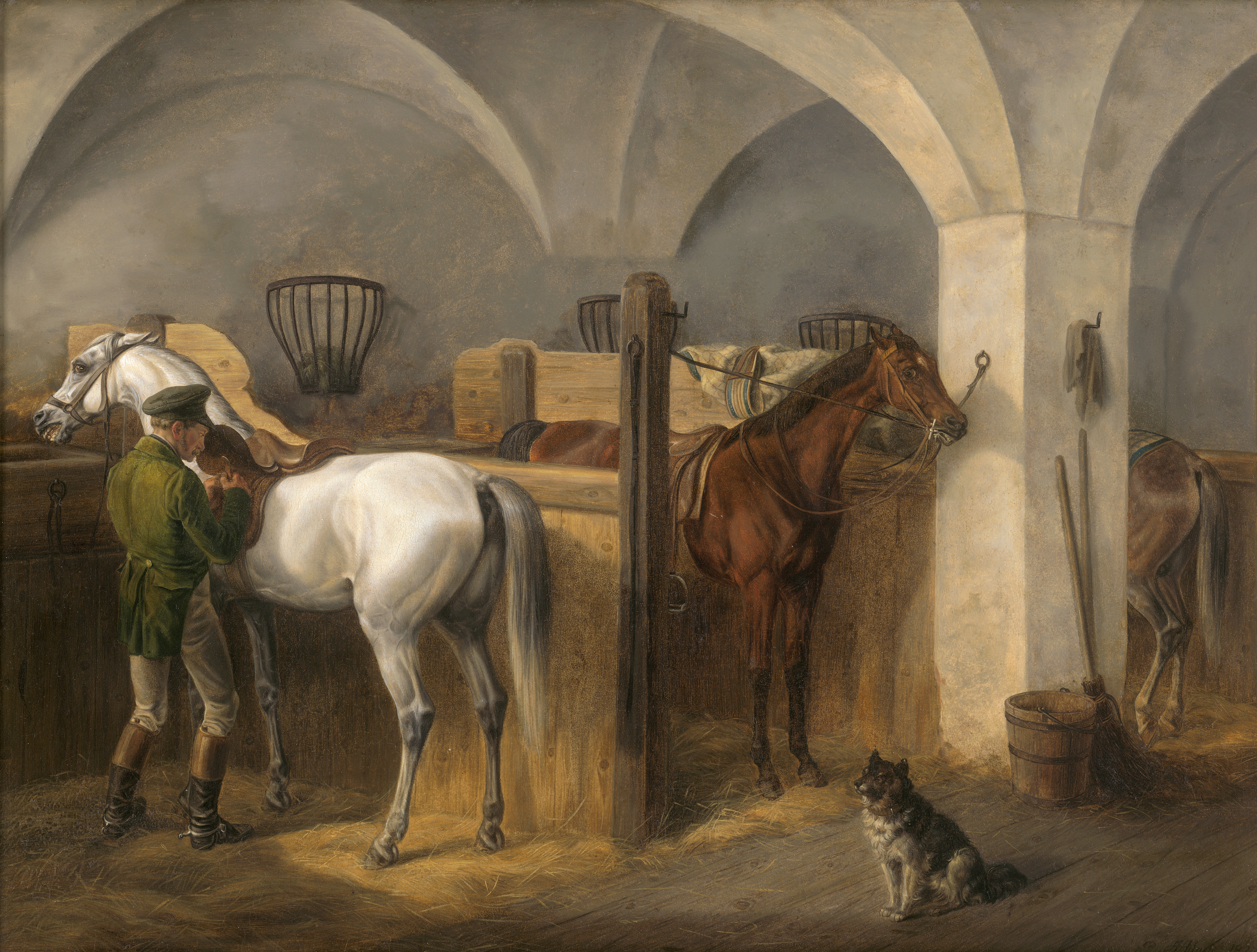 (1786 Nördlingen - 1862 München)Reitknecht mit drei Pferden und Hund im Stall