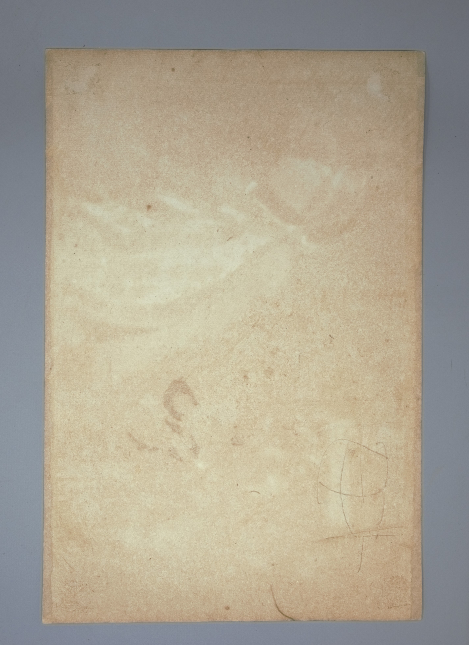 Kitsune (jap. "Fuchs") sind Fuchsgeister der japanischen Folklore, bekannt für Intelligenz, Verwandlungskunst und magische Kräfte. Mächtige Exemplare, wie dieser, besitzen bis zu neun Schwänze (kyûbi no kitsune - Neunschweif). Sie können menschliche Gestalt annehmen, häufig in der Form einer schönen Frau, und erscheinen sowohl als wohlwollende Schutzgeister als auch als listige Gestaltwandler und erotische Verführerinnen. – Vereinzelte Verschmutzungen in der Blattoberfläche, leicht papierbedingt gebräunt und braunfleckig.