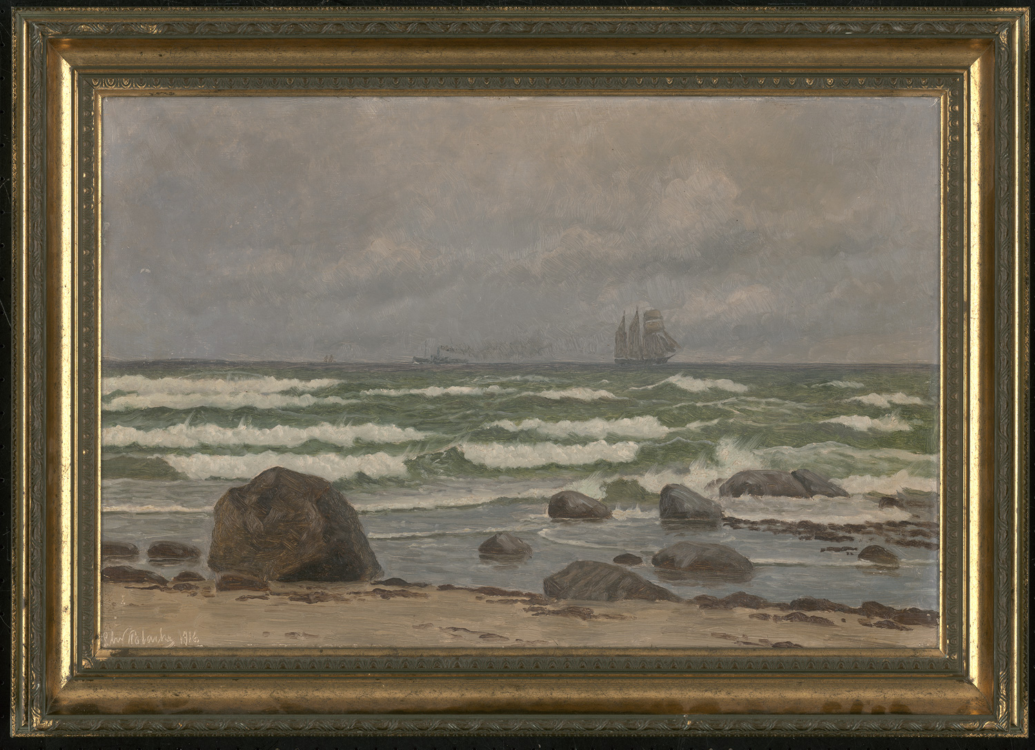Öl auf Leinwand. 40,1 x 60,7 cm. Unten links in der nassen Farbe signiert und datiert "Chr. Blache 1916" sowie verso auf dem Keilrahmen bezeichnet "Prof. Chr. Blache Stranden ved Hirtshals".