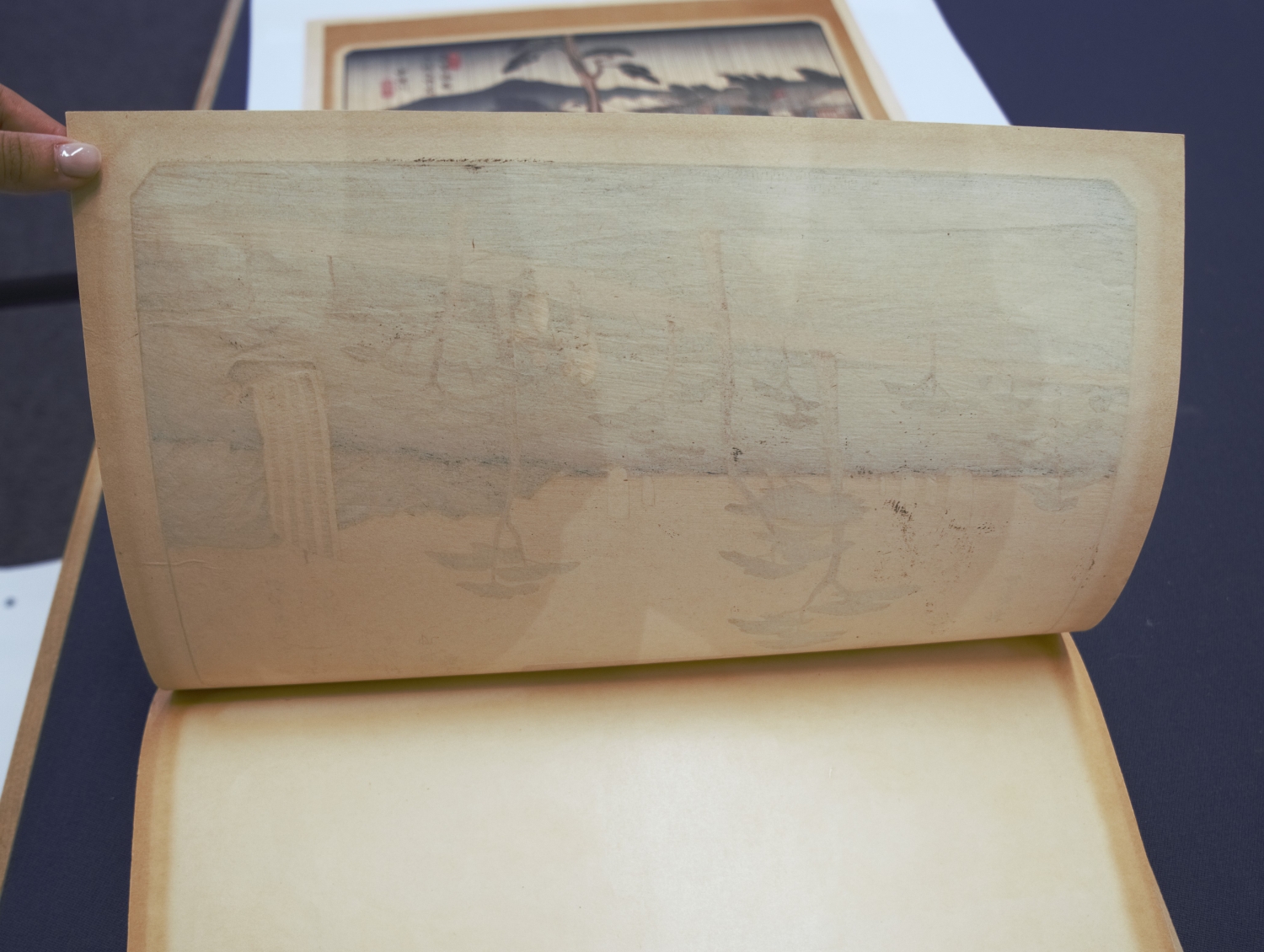 Aus der Serie der Neunundsechzig Stationen des Kiso Kaidô, die Utagawa Hiroshige zusammen mit Keisai Eisen schnitt. 1) Regen am Nikatsu Fluss. Mit weißen Reihern und senkrecht fallendem Regen, der sogar die Signaturen und Titel überschneidet. - 2) Zurückkehrende Segler Otomo Kihan. – Bildträger nur leicht, Ränder teils deutlich stärker gebräunt, mit Passepartout-Lichträndern am Rand, jedoch in recht überzeugender Farbigkeit und Frische. Druck auf Büttenpapier. - Aus der bedeutenden Sammlung Julius Kurth (1870-1949), Geistlicher, Pfarrer, Privatgelehrter und Autor mehrerer Bücher vor allem über japanische und chinesische Holzschnittkunst.