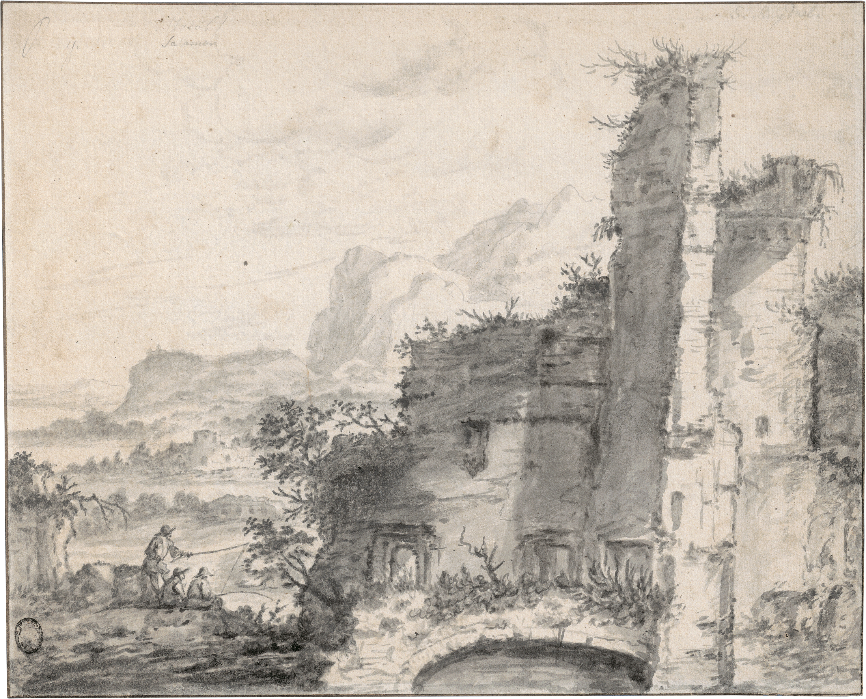 17. Jh. Fischer in einer Ruinenlandschaft.