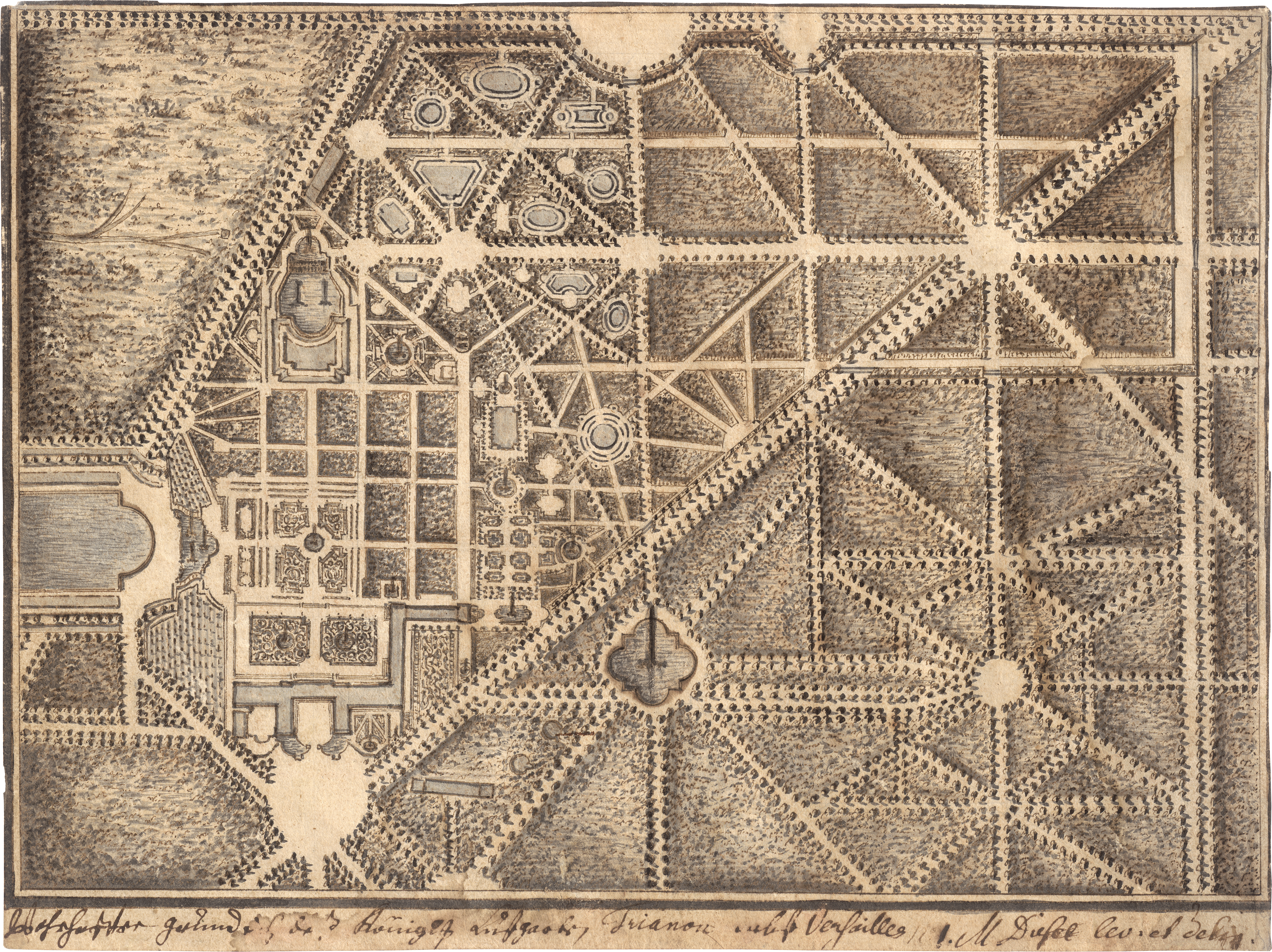 Vorzeichnung zu der von Carl Remshart gestochenen Tafel in dem Werk "Erlustierende Augenweide in Vorstellung herrlicher Garten und Lustgebäude", das 1717-1723 in Augsburg erschien. Beigegeben von Matthias Diesel die Vorzeichnung zu der von Johann August Corvinus gestochenen Tafel "Wahrhafter Grundriss des Königl. Lustgarten Trianon nechst Versailles" (Feder in Grau und Braun, grau laviert, 21,8 x 29 cm), unterhalb der Darstellung eigenh. betitelt und signiert.