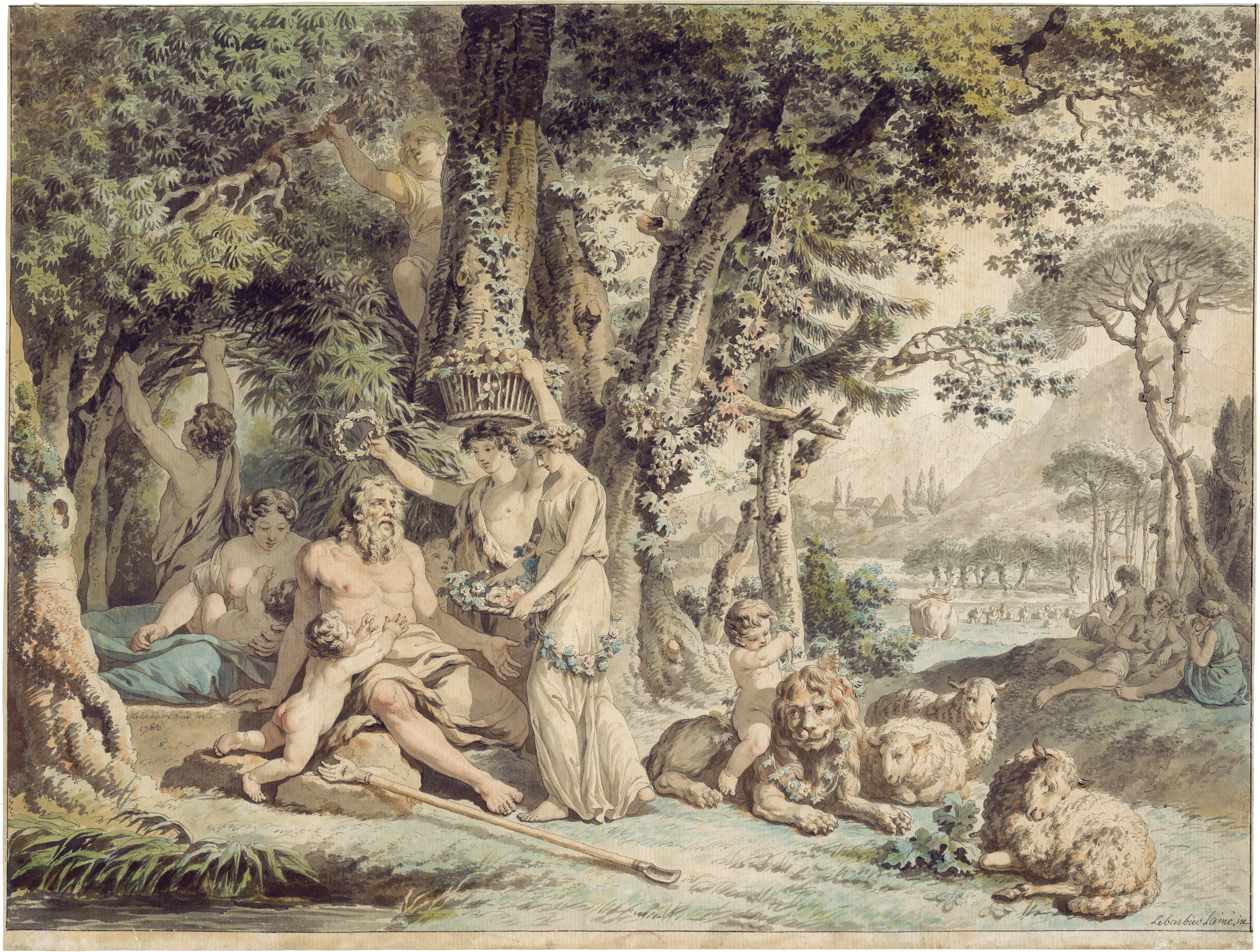 Der Maler, Zeichner und Kunsttheoretiker Jean Jacques François Lebarbier war Schüler von Jean Baptiste Marie Pierre an der Pariser Académie royale. Es folgten der obligate Romaufenthalt und eine Reise in die Schweiz, wo Lebarbier mit Salomon Gessner freundschaftlich verbunden war. 1780 wurde Lebarbier als Agrée, 1785 als Mitglied in die Akademie aufgenommen. Der Künstler wurde vor allem als Historienmaler und als Zeichner von Illustrationsvorlagen bekannt. Lebarbier arbeitete in einer verfeinerten und verhaltenen klassizistischen Formensprache, die charakteristisch für die Epoche Louis XV. ist. Die vorliegende, detailliert und bildmäßig ausgeführte Zeichnung wurde 1783 auf dem Pariser Salon ausgestellt und diente als Vorlage für eine Farbradierung des Jean-François Janinet (Portalis-Béraldi, S. 481, Nr. 64). Die pastorale Darstellung geht auf eine Passage aus Ovids Metamorphosen (Buch I, 89-150) zurück. In seiner zeichnerischen Präzision und Sorgfalt der Durchführung entspricht das Blatt allen Kriterien einer Stichvorlage. Dazu trägt auch das verfeinerte, verhaltene Kolorit aus sanften Braun-, Grün- und Blautönen wesentlich bei, das ganz der Ästhetik des ausgehenden 18. Jahrhunderts verpflichtet ist und eine für das empfindsame Zeitalter charakteristische poetische Atmosphäre erzeugt.