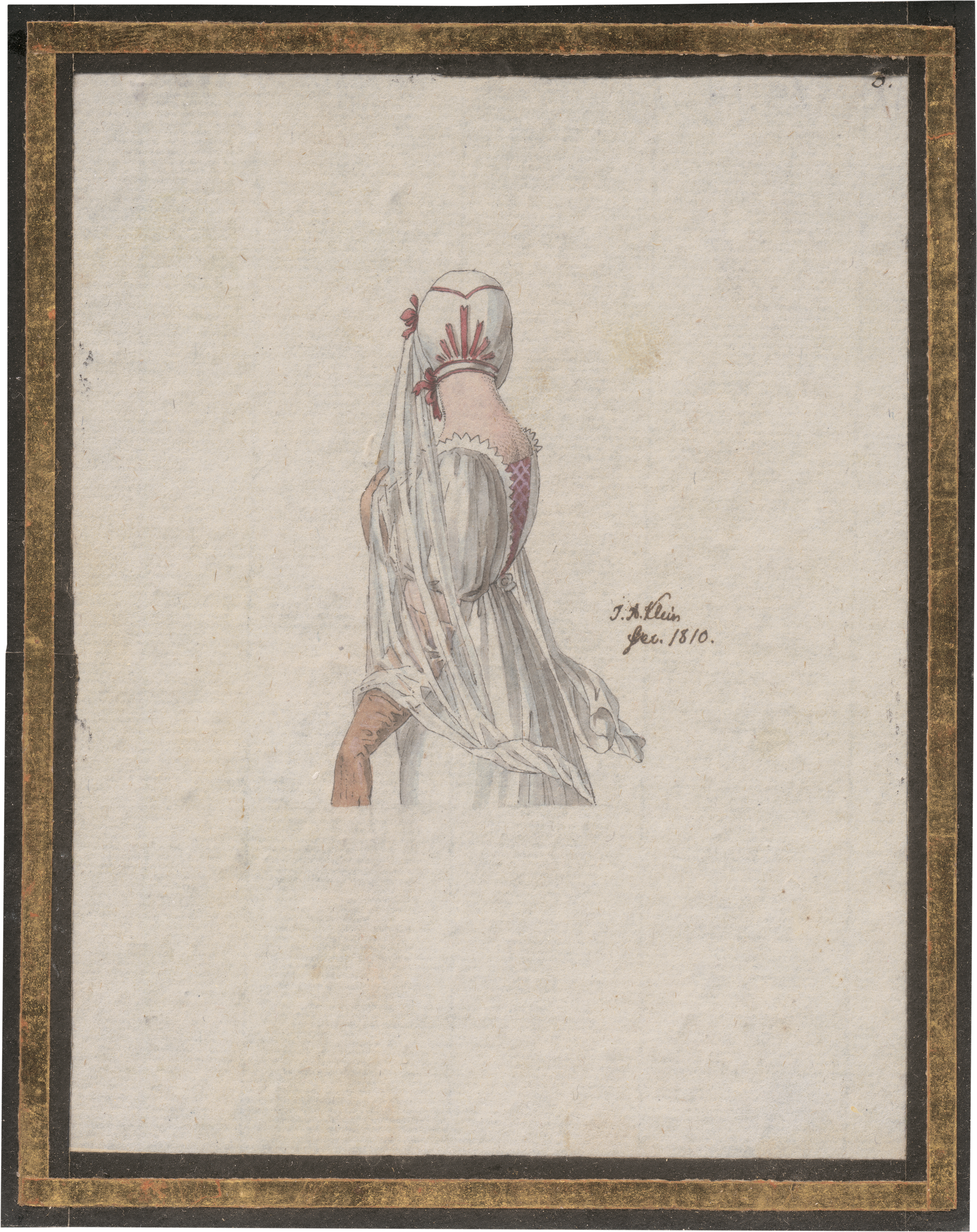 (1792 Nürnberg - 1875 München)Kostümstudie einer jungen Frau in Rückenansicht mit Haube, Schleier und Handschuhen