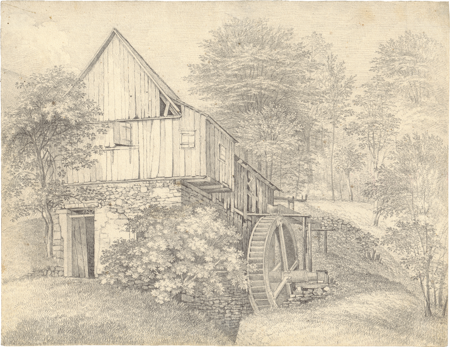Bleistift auf Velin, verso:Detailstudie zum Wasserrad in Bleistift. 16,5 x 21,5 cm. Wohl um 1810.
