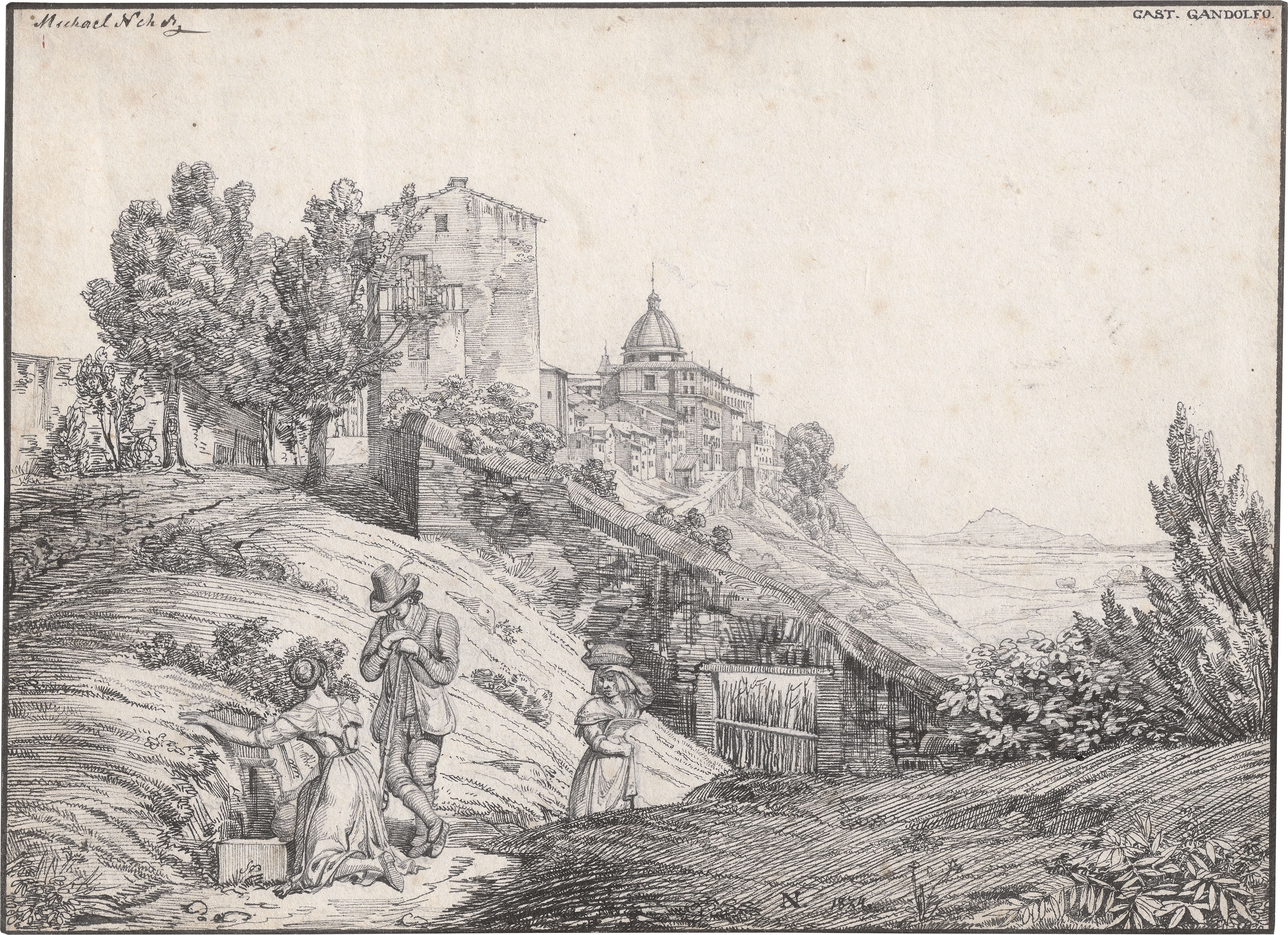 Feder in Schwarz. 17,2 x 23,6 cm. Unten in der Darstellung monogrammiert und datiert "N. 1824", oben links nochmal signiert (?) "Michael Neher" sowie oben rechts bez. "Cast. Gandolfo".