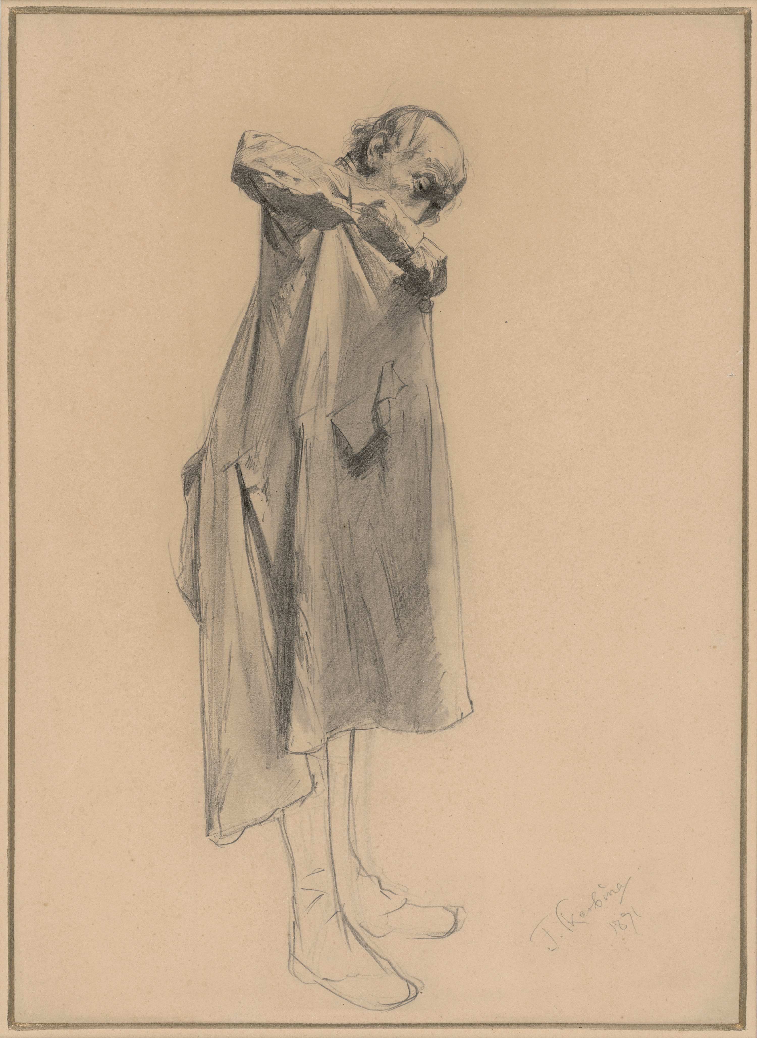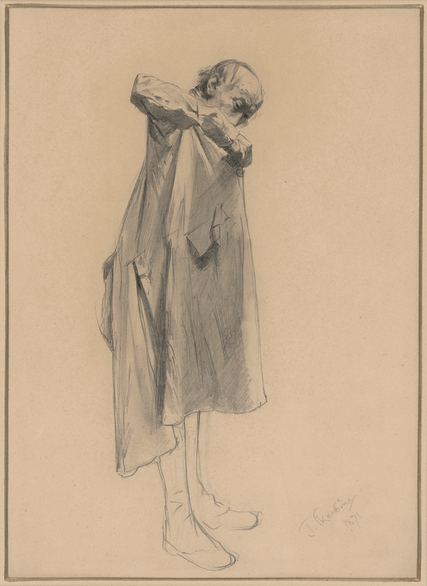 Beigegeben von Franz Skarbina eine signierte und datierte Bleistiftzeichnung "Mann, sich einen Mantel anziehend" (32,5 x 23,5 cm Passepartoutausschnitt) von 1891.