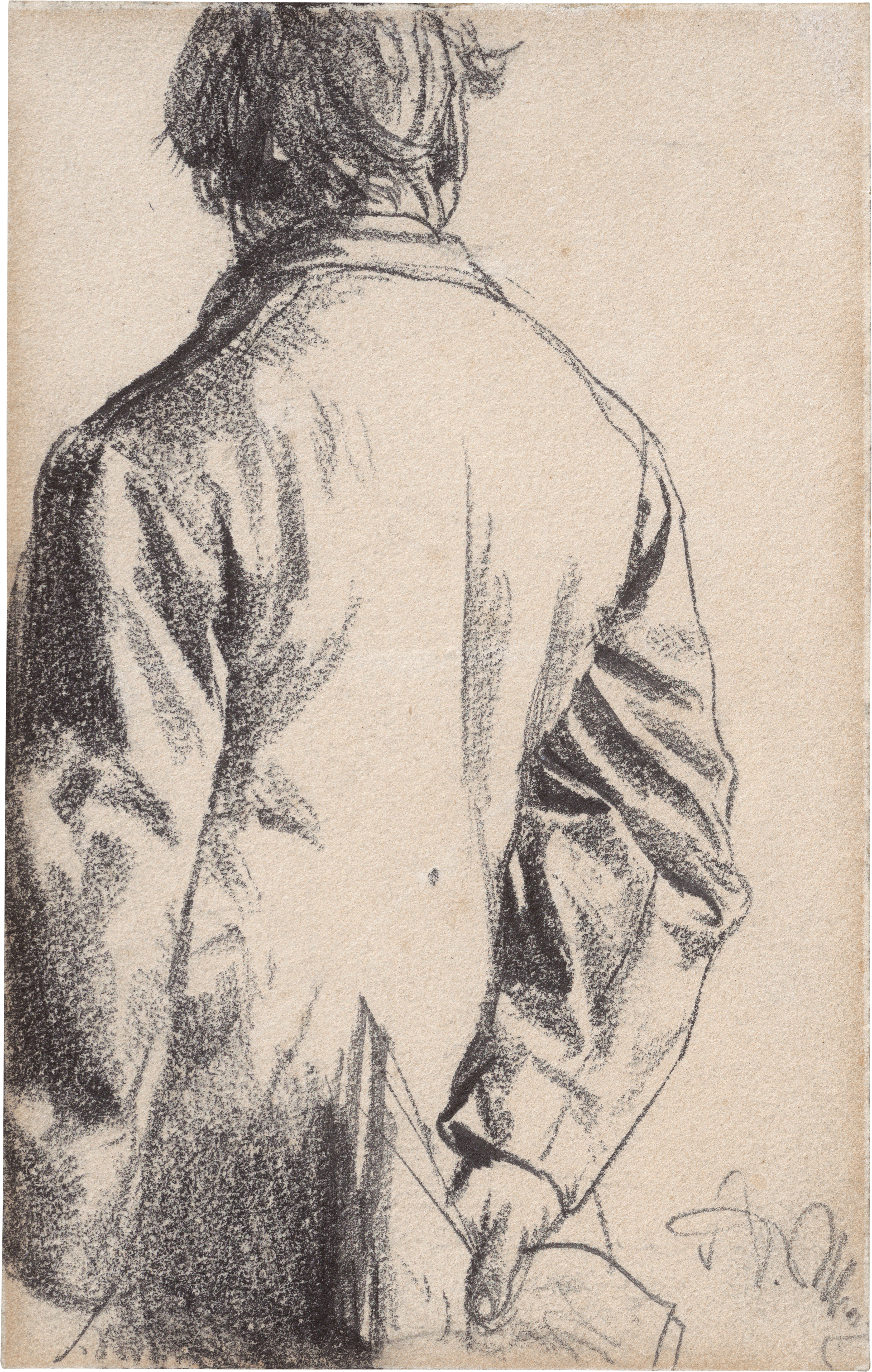 In einfallsreicher Reduktion zeigt Menzel hier einen Mann in Rückenansicht, der in einer flüchtig wirkenden Geste einige Blätter hinter dem Rücken hält. Die souveräne Linienführung und das virtuose Spiel mit Licht und Textur sind typisch für Menzels zeichnerische Manier, die selbst alltägliche Momente mit großer Eindringlichkeit erfasst. Die Wahl der Rückenansicht ist ein wiederkehrendes Motiv in seinen Skizzenbüchern - sie schafft eine geheimnisvolle Distanz und macht den Betrachter zum verborgenen Beobachter. Einen besonderen Reiz entfaltet die Komposition durch Menzels Nutzung der gesamten Höhe und Breite des Skizzenbuchblattes: Die Figur scheint aus dem Bildraum herauszuwachsen, als wäre sie nur zufällig vom Blatt eingefangen. Ein Kunstgriff, den Menzel häufig einsetzt, um Spontaneität und Unmittelbarkeit zu erzeugen.