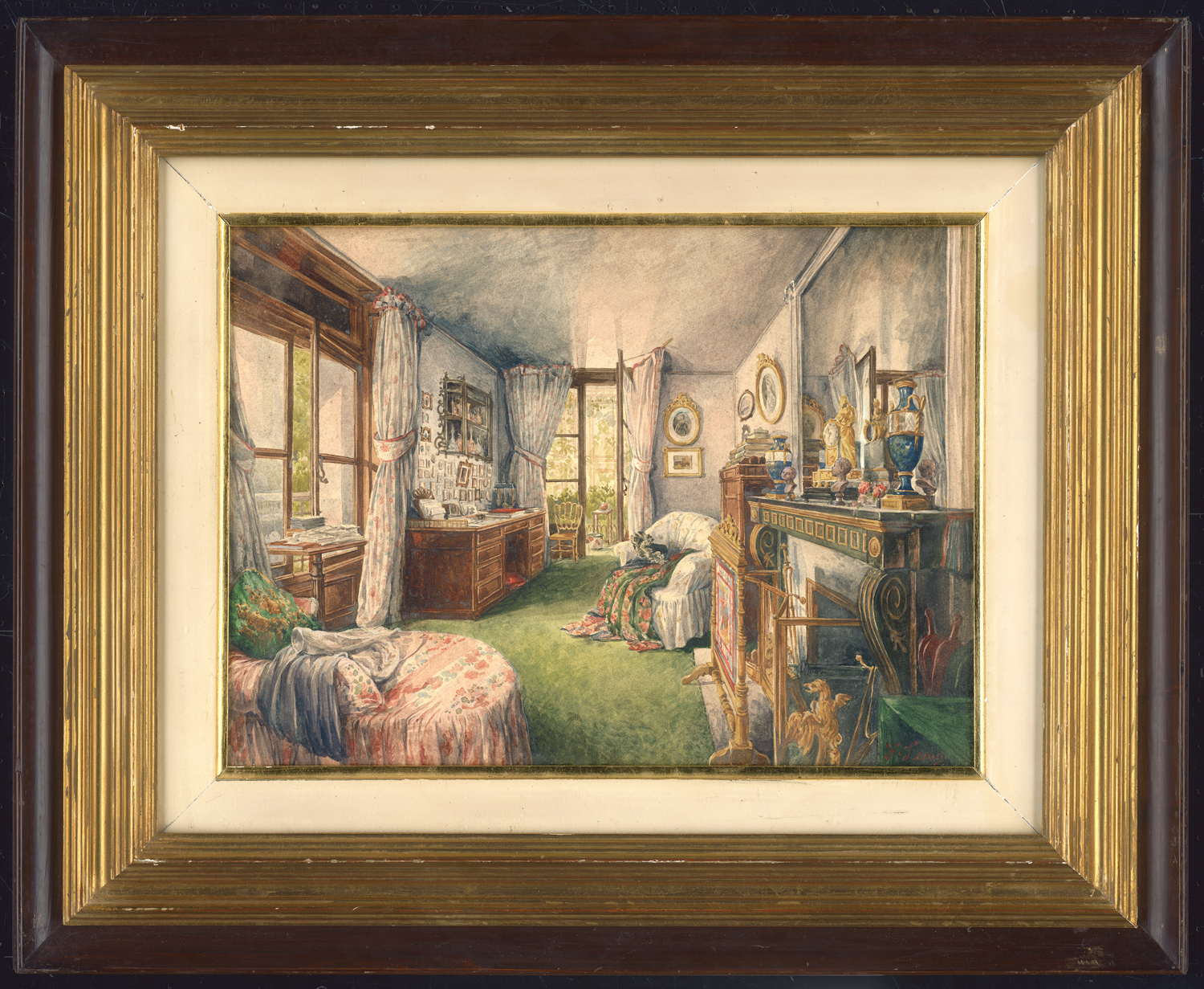 Das detailreiche Interieur gewährt einen Einblick in die Wohnkultur des gehobenen Bürgertums zur Zeit der Restauration. Die Fenster eröffnen den Blick ins Grüne, der Morgenmantel über der Récamière sowie die ungemachte Decke auf dem Sessel, vermitteln eine stille, friedvolle Atmosphäre, in Abwesenheit der Hausbewohner - ein Schauplatz des alltäglichen Lebens. Die persönlichen Gegenstände verdeutlichen dies: Auf den Tischen liegen Papiere verstreut, in einer Vitrine oberhalb des Schreibpults ist eine kleine Sammlung venezianischen Glases ausgestellt und zahlreiche Porträts schmücken die Wand über dem Schreibtisch - neben der Glastür ist ein Bildnis von Isabella Farnese zu erkennen. - Gerahmt beschrieben.