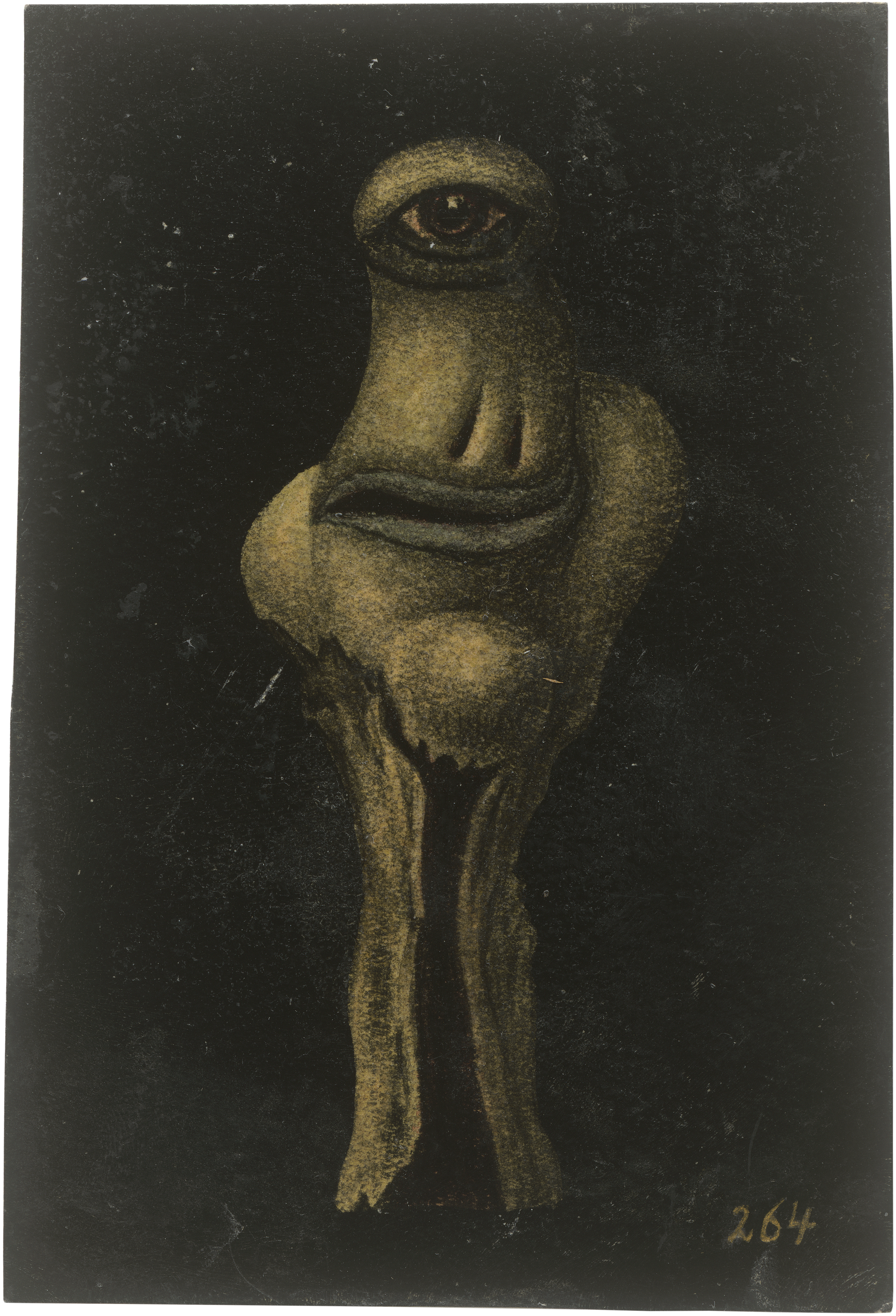 Aus dem schwarzen Hintergrund schaut uns ein Kopf auf zwei Beinen mit merkwürdig verschobenen Gesichtszügen entgegen; von Löwy feinsinnig gezeichnet und mit subtilen Schattierungen plastisch durchgestaltet.