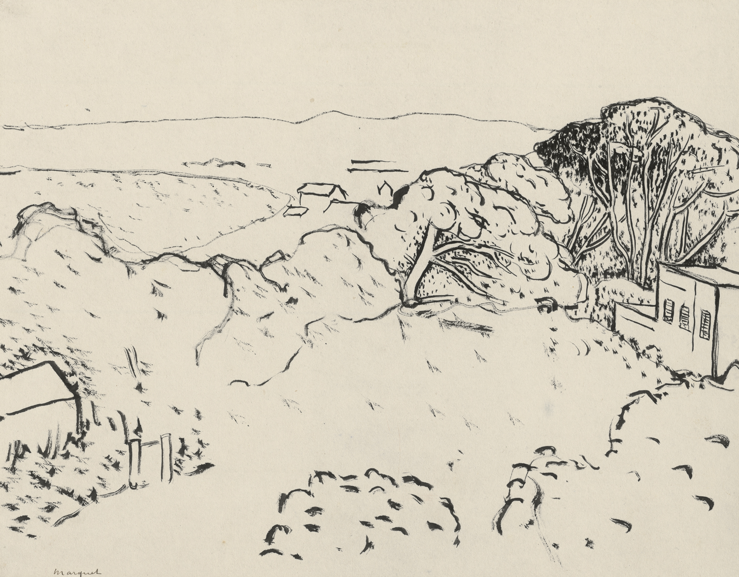 Schöne Landschaftszeichnung der Fauves-Zeit. Nach einer ersten gemeinsamen Ausstellung mit Matisse in der Pariser Galerie Berthe Weill 1902 zeigte Marquet seine Arbeiten 1905 im Pariser Salon d’Automne gemeinsam mit seinem engen Freund Henri Matisse, Maurice de Vlaminck, André Derain und anderen Künstlern. Diese Ausstellung führte zu einem Skandal, der den Kunstkritiker Louis Vauxcelles zur Prägung des Begriffs „Fauvismus“ inspirierte.