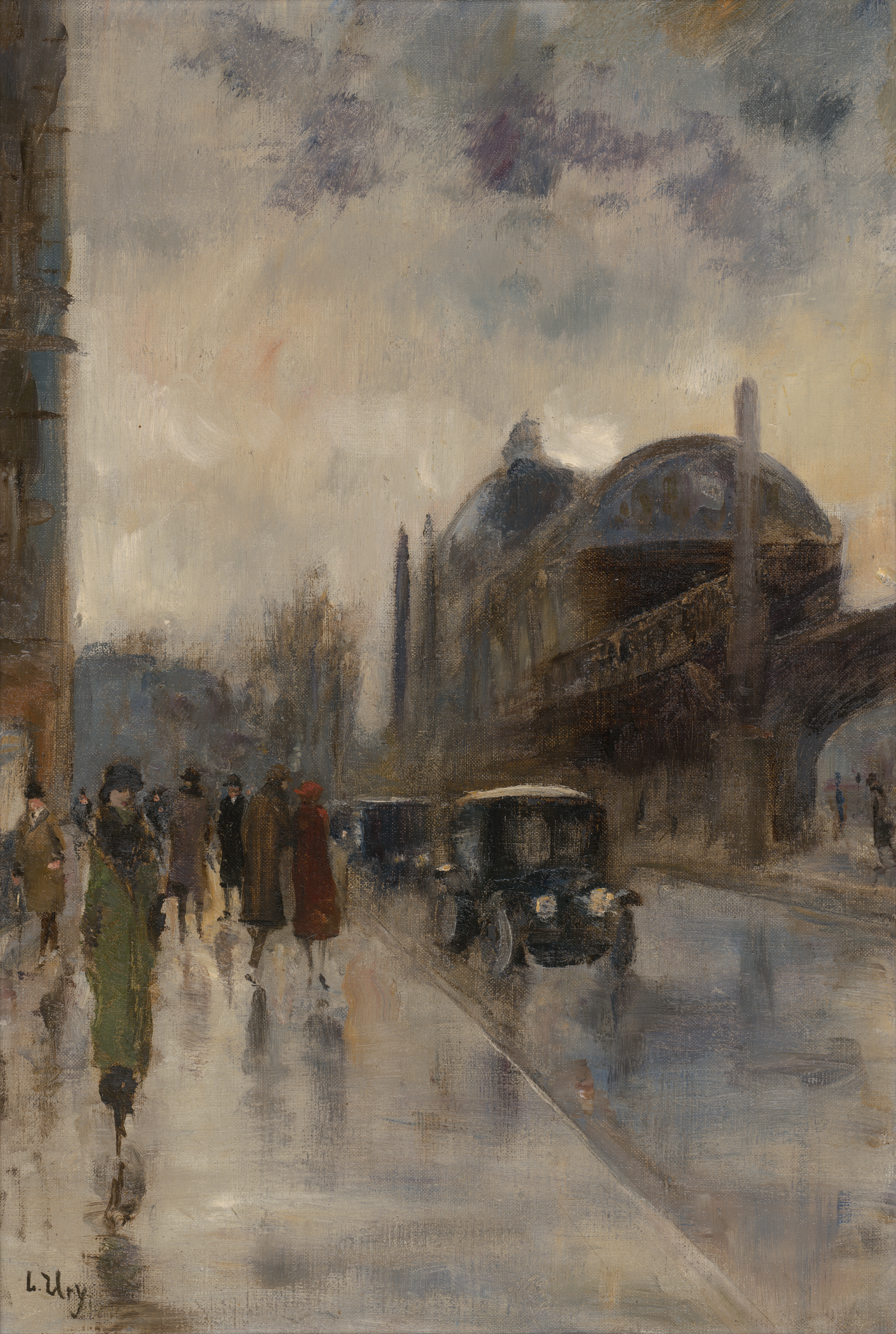 Er steht mitten auf dem Trottoir der belebten Bülowstraße und blickt zum Nollendorfplatz. Um diesen Blick einzufangen, verließ Ury die Isolation des Dachgeschosses direkt am Nollendorfplatz 1, die er zunehmend der menschlichen Gesellschaft vorzog, und wo er aus seinem Fenster in der vierten Etage einen guten Blick hatte. Rund um das (im Zweiten Weltkrieg zerstörte) Haus, in dem Ury von 1901 bis zu seinem Tod Wohnung und Atelier besaß, hielt er im Laufe von drei Jahrzehnten den Platz und die Umgebung in vielen Varianten, zu verschiedenen Jahres- und Tageszeiten künstlerisch fest. Heute erinnert am Bahnhof Nollendorfplatz, Nordausgang Kleiststraße, eine Gedenktafel an den Künstler. Das Spiel von Licht und Schatten auf der regennassen Straße belebt die urbane Szene der jungen Metropole ebenso wie die eleganten Passanten. Die vorbeiflanierenden Großstadtgeschöpfe, zarte und doch anonym bleibende schlanke Gestalten, dienen Ury in erster Linie als koloristische Objekte. Ein Vergleich ihrer Kleidung mit der Damenmode der Zeit legt Sibylle Groß zufolge eine Datierung des Gemäldes in die frühen 1920er Jahre nahe. Die Autos und die architektonische Kulisse des Bahnhofsgebäudes, ein glanzvoller Kuppelbau, wirken wie Insignien des pulsierenden Stadtverkehrs, den man im Bild beinahe als Geräuschkulisse wahrzunehmen scheint. Zunächst hatte sich Ury davor gescheut, Autos zu malen und blieb lange lieber bei den altvertrauten Pferdedroschken. Erst um 1920 tauchten regelmäßiger Autos in seinen Gemälden auf. Insgesamt jedoch dominieren weniger die konkreten Bildgegenstände das Gemälde, sondern vielmehr das Atmosphärische: Das Dämmerlicht, die Wolken und eine geradezu spürbare Luftfeuchtigkeit stehen im Vordergrund, festgehalten in feinsten wolkig-weich aufgetragenen Zwischentönen, den charakteristischen blau-bräunlichen Nuancen. „Er malt den Übergangszustand von Energie in Materie, überhaupt, nicht den Gegenstand, sondern einen Zustand.“ (Joachim Seyppel, Lesser Ury. Der Maler der alten City, Berlin 1987, S. 131). Die Echtheit dieser Arbeit wurde von Dr. Sibylle Groß, Berlin, am 10.05.2021 bestätigt. Das Gemälde wird in das in Vorbereitung befindliche Verzeichnis der Gemälde und Pastelle Lesser Urys aufgenommen. Eine Kopie ihrer Expertise liegt der Arbeit bei.