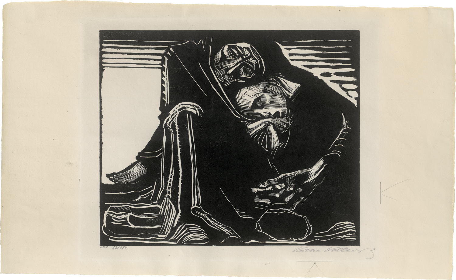Eines von 35 Exemplaren der Ausgabe B, erschienen in der Mappe "Jahrbuch der Originalgraphik", III. Jg., hrsg. von Hans W. Singer, Wohlgemut und Lissner, Berlin 1921. Neben 15 numerierten Exemplaren der Ausgabe A auf Japan und 100 Exemplaren der Ausgabe C. Nach dem Suizid ihrer Cousine Else Rautenberg 1920 setzte sich Kollwitz intensiv mit diesem Thema auseinander: Wie eine Mutter ihr Kind schließt der Tod die Frau behutsam in seine Arme und umhüllt sie schützend mit seinem schwarzen Mantel. Die Dornenkrone am vorderen Bildrand darf als das abgelegte Leid des Lebens gelesen werden. „Das hab ich mir so gedacht, dass der Tod die Frau sanft zu sich nimmt. Dabei bleibt der Dornenkranz unten liegen. Oder auch, er legt sie sanft hin, immer aber trägt sie nicht mehr die Dornen“ (Käthe Kollwitz, zit. nach: Beate Bonus Jeep, Sechzig Jahre Freundschaft mit Käthe Kollwitz, Berlin 1948, S. 222). Prachtvoller Reiberdruck, wohl mit dem vollen Rand.